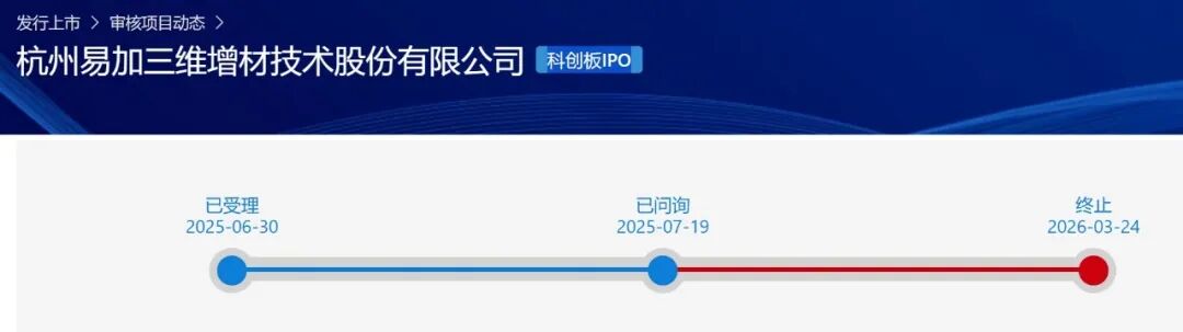 南极熊获悉,2025年3月24日,杭州易加三维增材技术股份有限公司在科创板主动撤回IPO申请,进程状态为终止。保荐机构为中信证券股份有限公司,审计机构为天健会计师事务所(特殊普通合伙),律师事务所为浙江天册律师事务所。易加增材于2025年6月30日申请科创板IPO,2025年7月19日收到审核问询,但此后问询回复未能挂网,直至2026年3月24日撤回IPO申请。2026亚洲TCT展会上,易加增材《