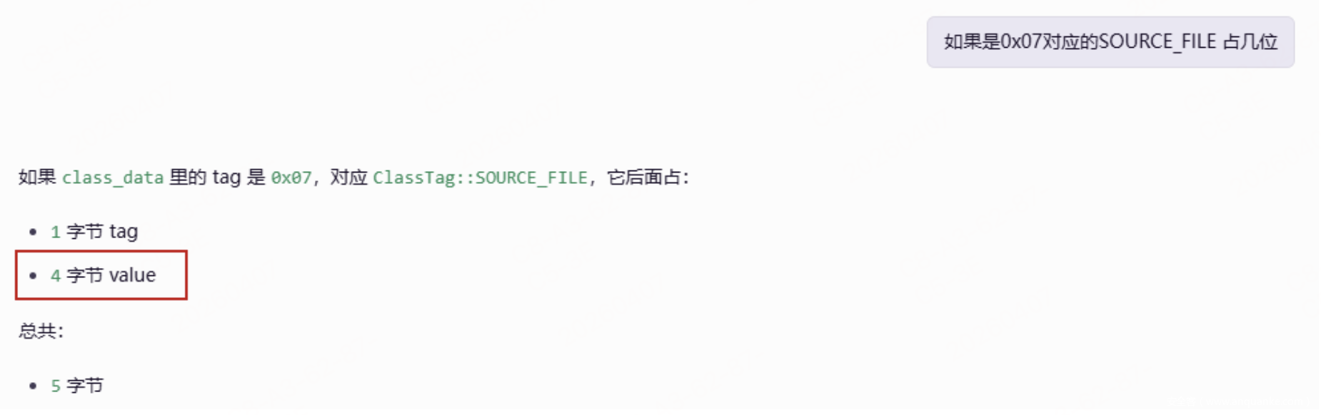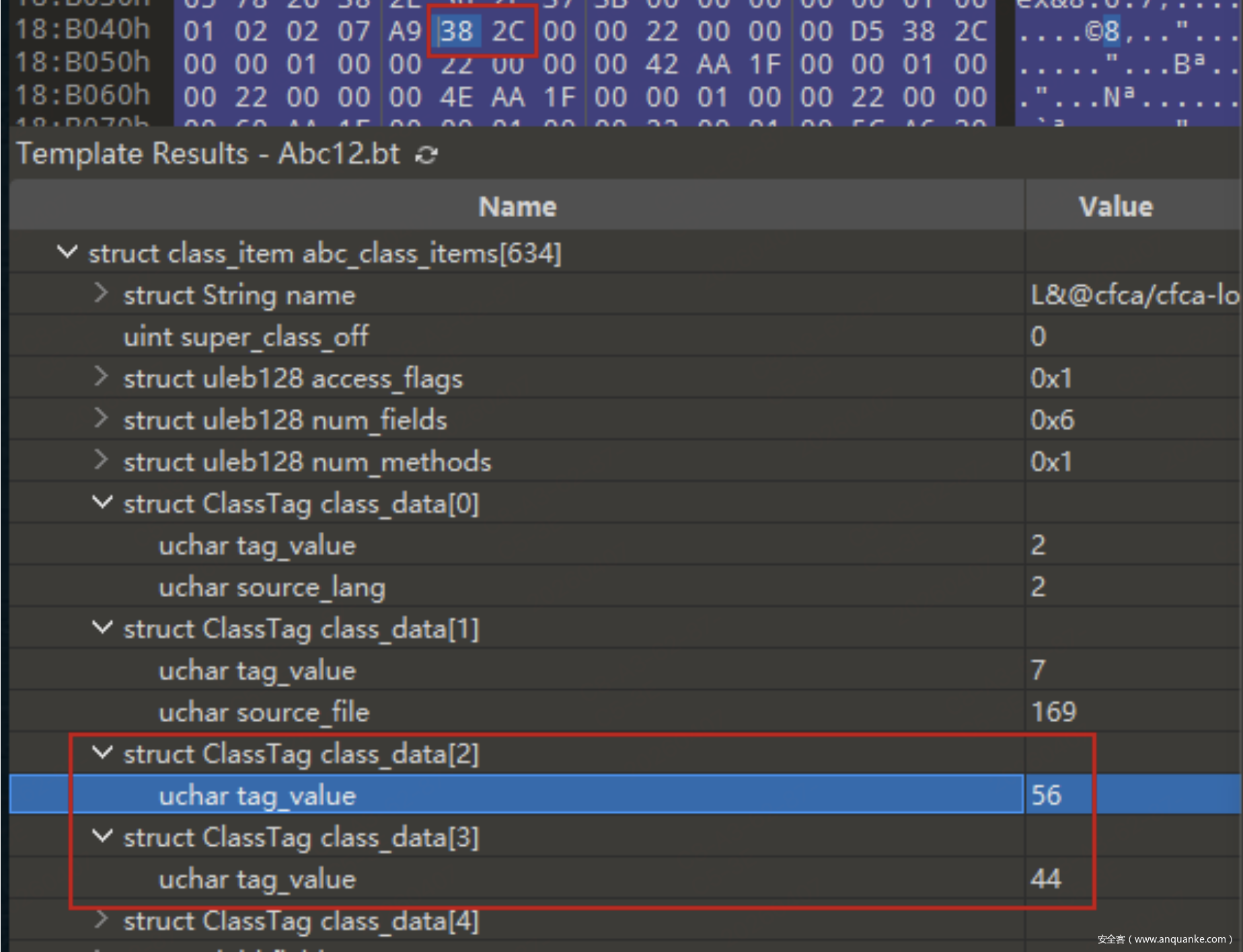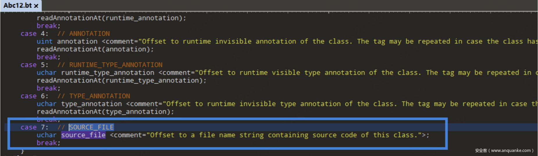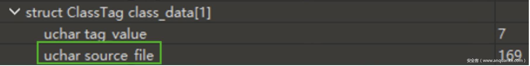 所以class_data的tag根本不存在0x38和0x2C。也就是说当tag等于7的时候,后面的偏移解析错误了。问题很有可能出现在下图中的绿色框中。此时需要确认一下,SOURCE_FILE是占几位。