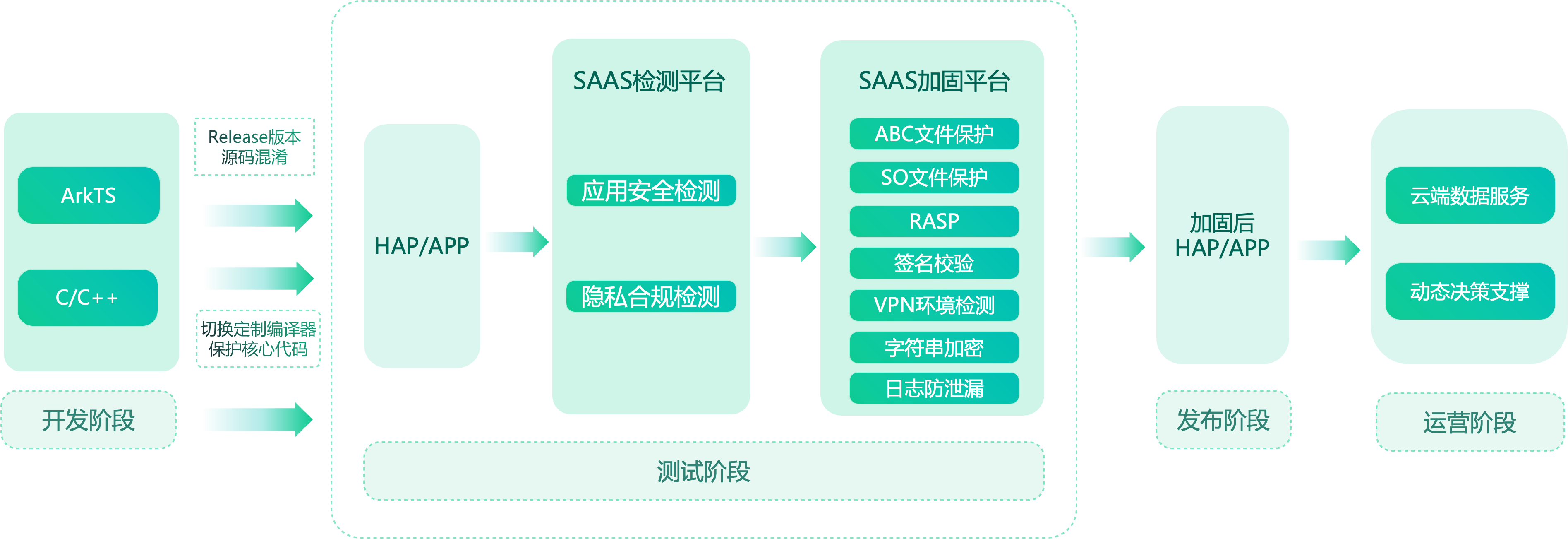 三六零天御鸿蒙应用安全保护方案通过持续的技术革新与深度优化,提供安全合规检测和安全加固服务,覆盖鸿蒙应用开发、测试、发布、运营全生命周期,通过构建从源头设计到持续运维的端到端防护机制,形成鸿蒙生态纵深安全防护体系。