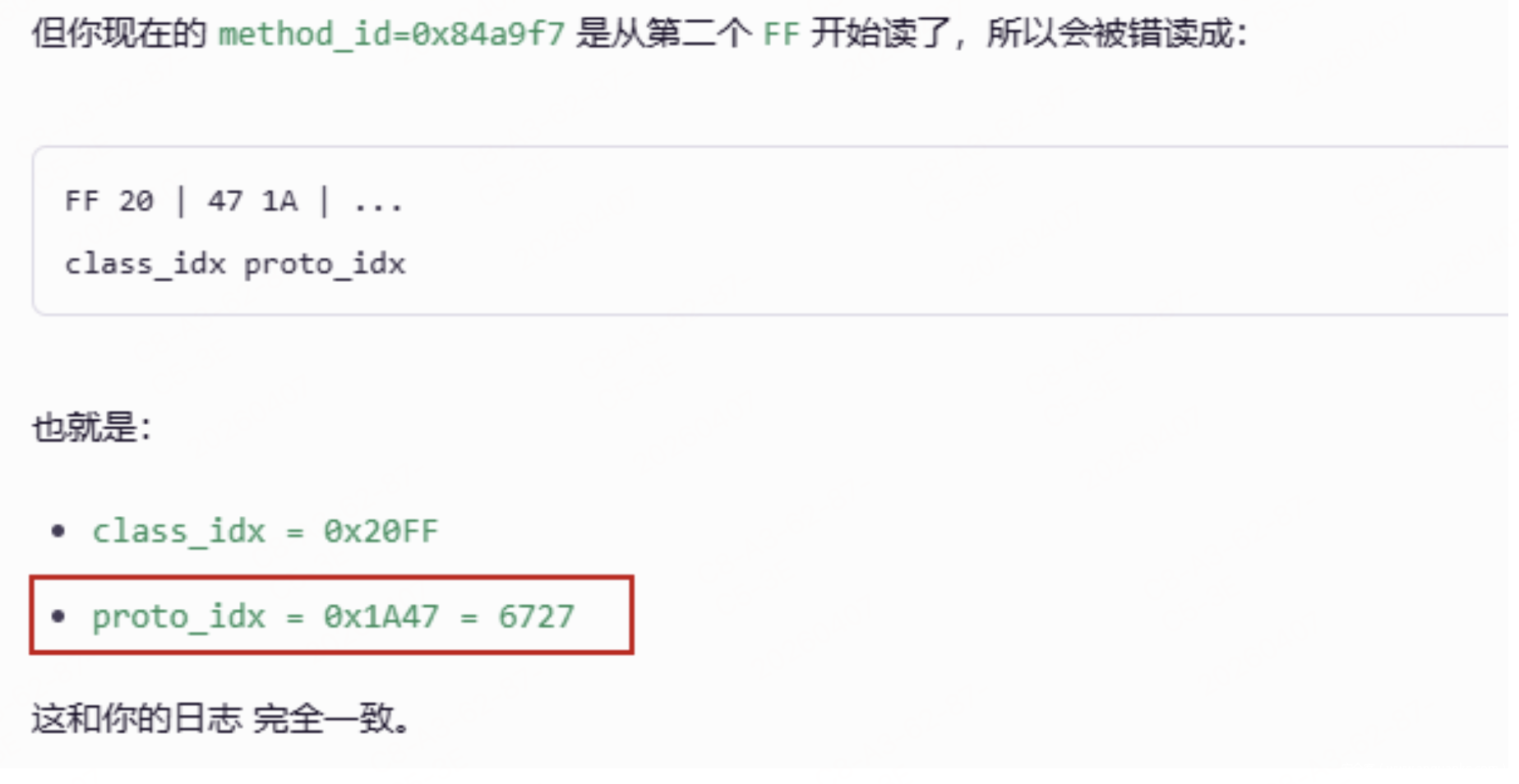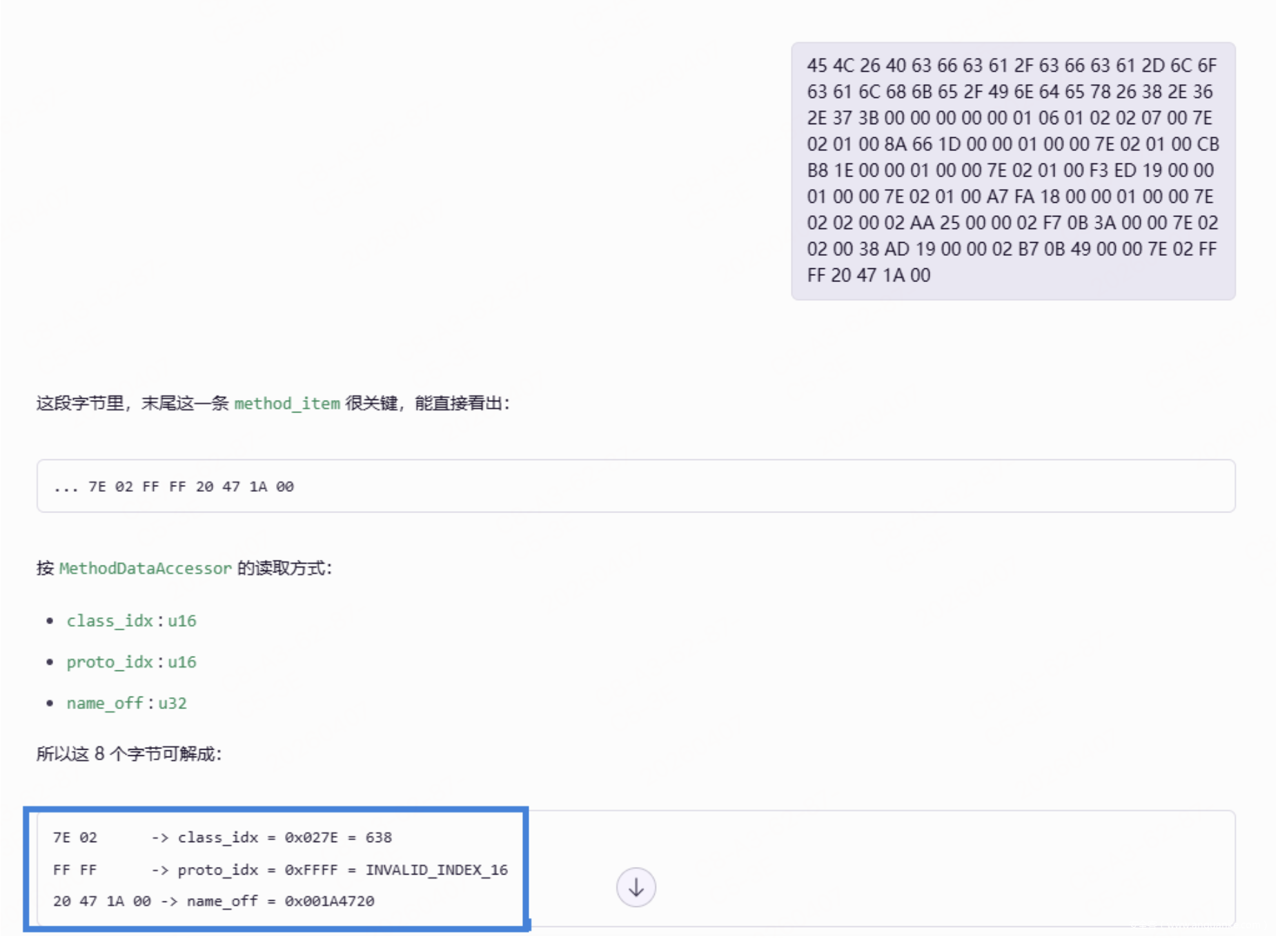AI可以正确分析这段十六进制值。而且解析出了proto_idx为0xFFFF。但是现实情况并不是这样。因为没有告诉它offset是什么。