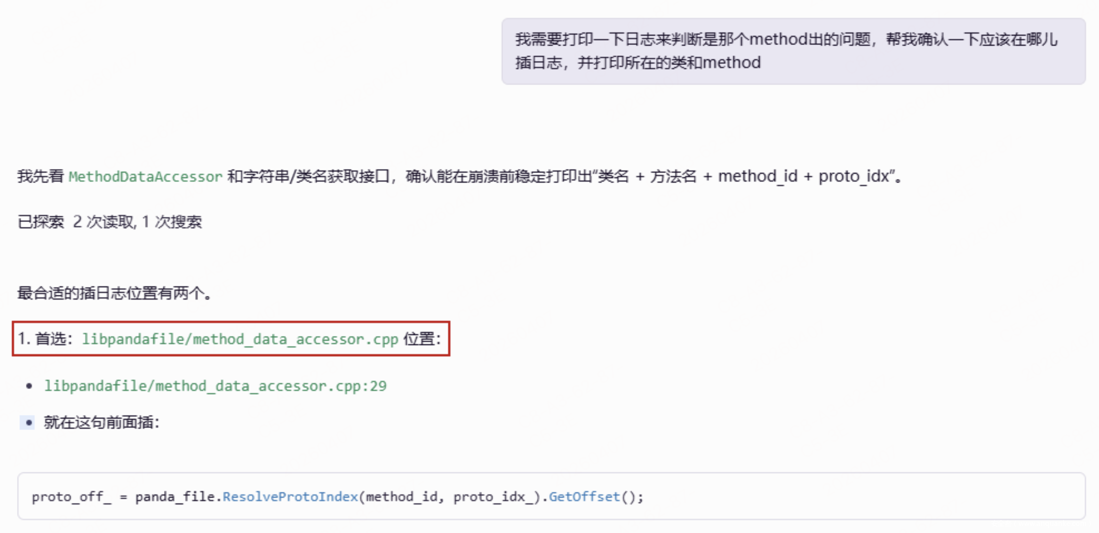 提示词: 我需要打印一下日志来判断是哪个method出的问题,帮我确认一下应该在哪儿插日志,并打印所在的类和method |