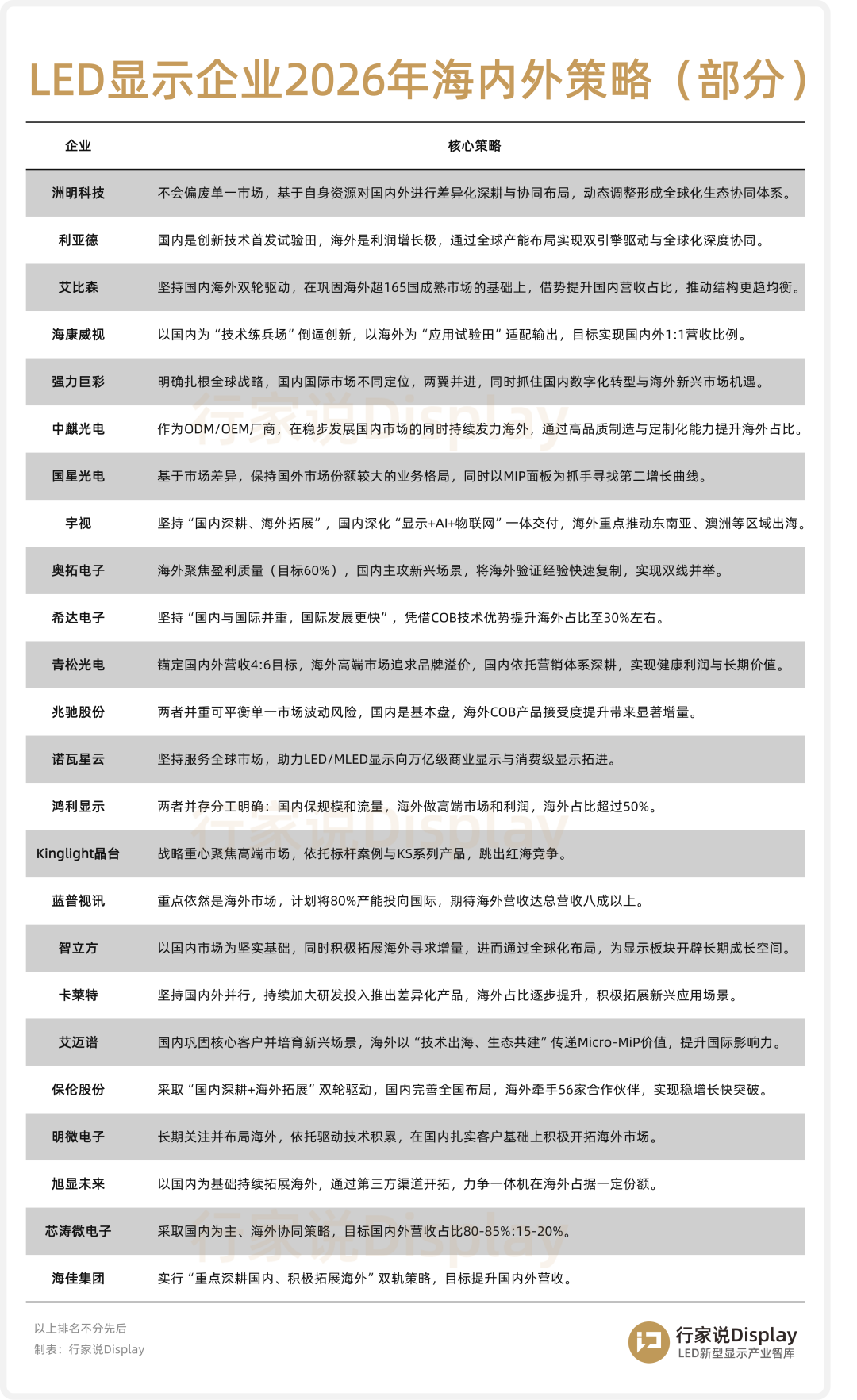 中麒光电:持续贯彻两者并重策略。中麒的定位是ODM/OEM,服务B端厂商,在稳步发展国内市场的同时,持续发力海外市场布局,通过高品质制造与定制化能力的输出,将进一步提升海外市场的业务占比。国星光电:显示产业的国内外市场呈现出明显不同的特征和需求格局。国外市场主要为工程租赁和新型显示市场,而国内主要以工程项目为主。这种差异源于不同市场的发展阶段、客户需求和竞争环境。国星的显示业务,直接或者间接客户,国外市场份额较大。国外市场主要为工程租赁和新型显示市场,而国内主要以工程项目为主。同时,我们以MIP(Micro Integrated Package)面板为抓手寻找第二增长点,持续提升MIP产品产能,降本增效。卡莱特:公司将坚持国内和海外市场并行,持续加大研发投入,针对国内外不同市场推出不同类型的产品。2026年也会持续加强品牌管理和宣传、让更多用户能使用到我们的产品。一直以来,全球化是卡莱特的重要战略之一,卡莱特营收呈增长态势,海外市场占比也在逐步提升,在稳固国内业务的同时大力发展海外市场,积极拓展新兴应用场景。艾迈谱:我们坚持国内与海外市场并重的战略。在国内,我们依托完整产业链,实施“双线并行”:巩固核心客户的灯珠供应,同时通过面板解决方案培育新兴场景,快速建立MiP技术生态与市场认知。在海外,以“技术出海、生态共建” 为核心,通过深度的技术交流与案例解析,向全球产业伙伴与潜在用户传递Micro-MiP技术价值,建立技术认知与信任,提升公司在国际专业领域的影响力与品牌知名度。保伦股份:2026年,我们将采取 “国内深耕+海外拓展”双轮驱动战略,实现两者并重。我们通过建设itc保伦股份工业园,与多所学校、研究院建设联合实验室,已牵手56家国外优质战略合作伙伴,深化全球化战略布局,让国产品牌走向世界,助力全球用户迈向更高效、更智能和更可持续的发展模式。此外,itc持续深耕区域市场,通过在北京、南京、上海、湖北、浙江、四川、重庆、陕西、山东、安徽等地部署子公司,完善全国战略布局;同时在各地子公司全面开启产品经理班特训营,实现以“专业赋能+场景深耕”的核心发展战略,探索符合区域特色的智能化应用场景。我们期望2026年,实现国内市场稳增长、海外市场快突破的良性格局,通过双市场协同发展。宇视:宇视在商用显示领域将坚持"国内深耕,海外拓展"的双轮驱动战略,2026年将加大海外拓展力度,实现海外高额的增长目标。国内方面依托宇视在智慧城市,交通,能源,教育等行业的深厚积累,继续深化显控与行业解决方案的融合,加大AI+智慧显控系统的创新融合,推动创新技术在新场景的落地,尤其在指挥中心,会议协作,数字展厅,信息发布,工业SOP等场景中强化"显示+AI+物联网"一体方案交付能力。海外方面,借助宇视全球化的销售与服务网络,重点推动高端商用显示产品与解决方案出海,尤其是在拉美,澳洲,中东,东南亚等区域,通过本土化合作与行业定制,提升品牌影响力与市场份额。海外主导型企业以追求更高利润、品牌溢价及跳出国内“红海”竞争,明确将海外市场作为营收主引擎,部分设定了海外占比超60%的高目标,并认为海外高端市场对创新技术和品牌解决方案支付意愿更强,项目利润率和回款质量更优。以下为部分企业观点:奥拓电子:公司采取海内外市场双线并举的策略,海外聚焦盈利质量,国内主攻新兴场景。海外市场是2026年增长与盈利的核心驱动。行业将受益于全球体育赛事与大型活动复苏带来的需求。其优势在于客户付费能力强,项目利润率高,回款条件优;以及沉浸式演艺等前沿应用落地迅速,易形成高融资能力的标杆项目,经验可反哺国内。国内市场的关键在于场景拓展。沉浸式演出、虚拟拍摄、商业文旅等项目正加速落地,市场空间广阔。公司将依托海外已验证的经验与模式,实现国内市场的快速复制。基于公司擅长服务海外地标项目、顶级活动与头部客户的竞争优势,2026年营收结构目标设定为海外60%,国内40%。青松光电:国内海外业务双线并举、齐头并进。2026 年,公司坚定推行国内外业务并重的发展战略,持续做大营收规模,锚定国内与海外营收 4:6 的占比目标。这一战略布局的核心逻辑在于,海外高端市场对创新技术与品牌解决方案具备更高的溢价空间和稳定的市场需求,国内市场则依托内部营销体系的协同发力稳步深耕,二者结合高度契合青松追求健康利润与长期品牌价值的核心诉求。2026 年,面对国内外全新的经济形势,公司将通过本地化运营落地,扎实推进全维度经营管理与全局统筹;全球化布局所积淀的品牌价值与凝聚的技术牵引力,将持续协同青松海内外业务的发展。希达电子:2026年,我们将继续坚持“国内与国际并重,国际发展更快”的策略。由于希达的产品在技术性能和显示效果上具备国际竞争力,更符合海外市场对高端显示的需求,因此国际市场的增速将高于国内。目前公司产品已覆盖全球主要市场,包括欧美、日韩、东南亚、中东等地区,通过自有销售团队与合作伙伴网络持续拓展。2026年海外营收占比预计提升至30%左右。蓝普视讯:2025年,我们积极布局和拓展海外市场,业绩迎来突破增长,并在荷兰和沙特阿拉伯等多地建立海外本地仓库和办事处,2026年,我们重点依然是海外市场,未来公司计划将80%的产能给到国际市场,期待海外营收能达到总