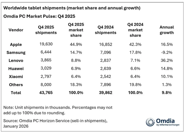Omdia称,2025年,平板电脑市场实现了自2020年疫情驱动需求激增以来的最高年度出货量。季节性假日需求,加上供应商在预期内存供应紧张前的预先生产活动,为第四季度的出货量提供了显著提升。
