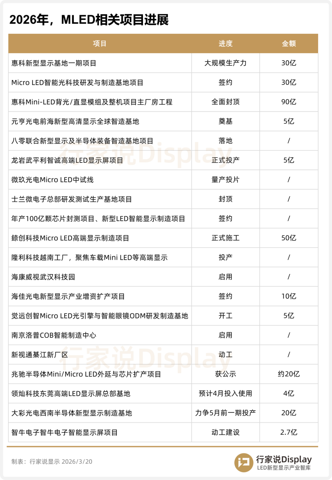■ 兆驰半导体Mini/Micro LED外延与芯片研发制造扩产项目公示3月16日,江西省投资项目在线审批监管平台正式公布“南昌高新区兆驰半导体Mini/Micro LED外延与芯片研发制造扩产项目”,项目编号为2603-360100-04-01-634469。据介绍,该项目申报单位为兆驰半导体,计划于2026年5月开工建设,预计于2028年5月竣工。项目总投资额约20亿元,其中设备投资额约15亿元。项目主要建设内容为在高新区新增投资购买24腔蓝绿MOCVD设备、20腔红光MOCVD设备及相关配套芯片研发生产设备用于扩产,新增LED芯片月产能约40万片。■ 领灿科技东莞高端LED显示屏总部基地预计4月前后正式投入使用据山水谢岗消息,领灿科技总投资4亿元建设的东莞高端LED显示屏总部基地,目前已建设完成,计划于4月前后正式投入使用。项目投用后,领灿科技位于深圳的厂区及东莞伊伯工业园的现有生产单位将整体搬迁至此,实现生产资源的集中与升级。届时,公司员工总人数预计将从此前的基础上扩增至600人左右。此次建设新总部基地,主要是为了应对企业持续的产能扩张需求。随着市场订单的增长,领灿科技原有的生产空间已趋于饱和,新基地将主要承担承接新增产能、优化生产流程的使命。据介绍,领灿科技自正月初八正式开工,生产线正全力赶制春节假期前后积压的订单。其公司人力资源部专员张尚雄表示,由于产品以外销为主,假期期间产生的订单需快速消化。“目前公司所有生产单元都在满负荷运转,以确保所有批次产品能按时交付。”张尚雄介绍,春节后国内外新订单也在持续流入,市场需求保持旺盛。虽然一季度面临节后复工与产能爬坡的双重压力,但公司将通过科学排产稳步推进,有信心达成一季度既定的营收目标,并为全年业绩增长打下坚实基础。3月18日,中山市港口镇举行第一季度重点项目集中动工仪式,中山市智牛电子有限公司投资的“智牛电子智能显示屏项目”等6个项目同步动工建设。据介绍,智牛电子智能显示屏项目由国家高新技术企业中山市智牛电子有限公司投资建设,总投资2.7亿元,总建筑面积超40400平方米,建成后将重点布局投影机主板、室内外LED显示屏、智慧城市路灯显示屏等产品的研发与生产。项目达产后预计年产值超7亿元,年税收贡献超1649万元。■ 大彩光电西南半导体新型显示制造基地力争5月前实现一期产线投产据内江经开区消息,大彩光电西南半导体新型显示制造基地项目建设正按计划有序推进,一期厂房主体结构已实现封顶,消防管道安装、外窗装修等内部收尾工程正在同步进行,为后续的净化车间装修与设备搬入做准备。根据规划,该项目预计于2026年1月底启动核心生产区域的净化装修工程,并力争在2026年5月前实现一期产线正式投产运行。投资建设方浙江大彩光电技术有限公司,是国内LED显示屏制造领域企业,其产品凭借在高清晰度、低能耗与高环境适应性等方面的优势,已广泛应用于智慧城市、高端商业展示及专业演艺舞台等领域。四川大彩光电技术有限公司总经理何小勇介绍,整个项目总投资约20亿元,分两期推进,全面建成达产后,预计可实现年产值约35亿元。其中:一期投资约8亿元,租赁标准厂房3万平方米,主要建设采用SMD封装技术的LED显示模组生产线及相关配套,预计达产后年产值可达15亿元。二期计划投资约12亿元,将先期租用厂房3.6万平方米,并逐步完成两期厂房整体回购,重点建设基于COB封装技术的LED超高清显示模组生产线,预计可新增年产值20亿元。