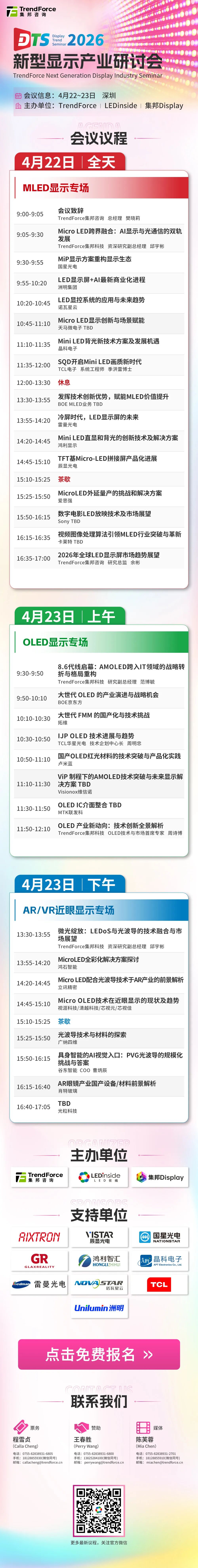 LEDinside整理免费报名2026新型显示产业研讨会(DTS),共同解码MLED、OLED发展。4月22-23日深圳见!