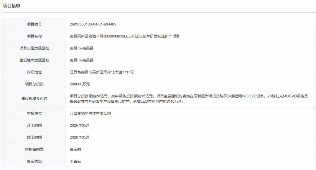 3月16日,江西省投资项目在线审批监管平台正式公布“南昌高新区兆驰半导体Mini/Micro LED外延与芯片研发制造扩产项目”,项目编号为2603-360100-04-01-634469。该项目申报单位为兆驰半导体,计划于2026年5月开工建设,预计于2028年5月竣工。项目总投资额约20亿元,其中设备投资额约15亿元。项目主要建设内容为在高新区新增投资购买24腔蓝绿MOCVD设备、20腔红光MOCVD设备及相关配套芯片研发生产设备用于扩产,新增LED芯片月产能约40万片。值得一提的是,除上述项目外,近日,兆驰股份也透露了高速光模块项目、激光芯片项目建设最新进度。此前,兆驰股份相继通过子公司兆驰半导体、兆驰光联投建年产1亿颗光通信半导体激光芯片项目(一期)以及光通信高速模块及光器件项目(一期)。高速光模块方面,已建成近5万平方米洁净生产基地,200G及以下光模块已规模化生产,400G/800G模块完成小批量生产并推进量产,1.6T模块研发中。激光芯片方面,公司通过增补设备建成生产线,目前已成功建成了激光芯片生产线。此外,兆驰股份在Micro LED光源芯片取得突破。3月12日,公司宣布,面向Micro LED光互连CPO(共封装光学)技术的Micro LED光源芯片已顺利完成研发工作,目前正式处于样品验证测试阶段。3月16日,新视通通过官方视频号宣布,其綦江新厂区正式动工建设,标志着企业产能扩张迈出坚实一步。官方资料显示,新厂区将引入智能化生产线,计划打造西南地区的重要智能显示生产基地。新视通是一家专注LED显示领域的高科技企业,主要提供小间距LED显示屏ODM解决方案。2023年,公司总投资10亿元的LED显示屏核心生产基地已启动建设,分三期推进:一期、二期投资4.8亿元,建设P0.6—P2.5 Mini LED屏生产线,一期于2022年投产,二期于2023年实现首条生产线量产,采用COB封装;三期投资5.2亿元,将建设先进封装生产线,支持自主研发芯片及Micro LED屏生产。合作方面,1月,公司与飞利浦商显签署生态战略合作协议,聚焦高端商用场景,开展Micro LED及COB产品定制化开发,并延伸至专业视听系统全链路整合。产品方面,在ISLE 2026展会,新视通首发户外小间距屏,产品特点包括高黑占比、低功耗及高亮度。