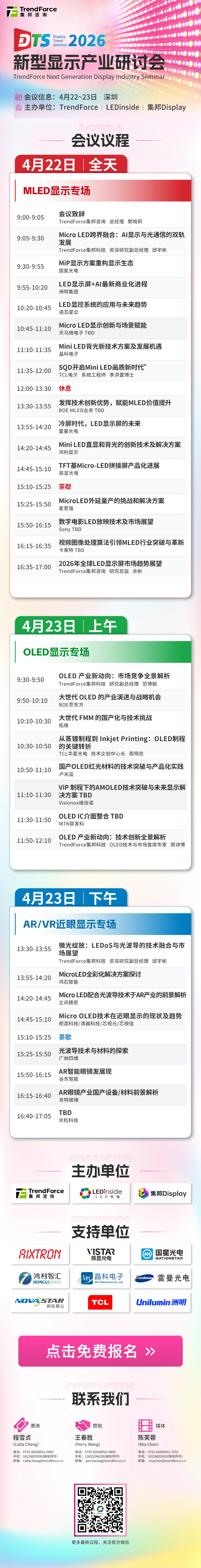 LEDinside整理免费报名2026新型显示产业研讨会(DTS),共同解码MLED、OLED发展。4月22-23日深圳见!