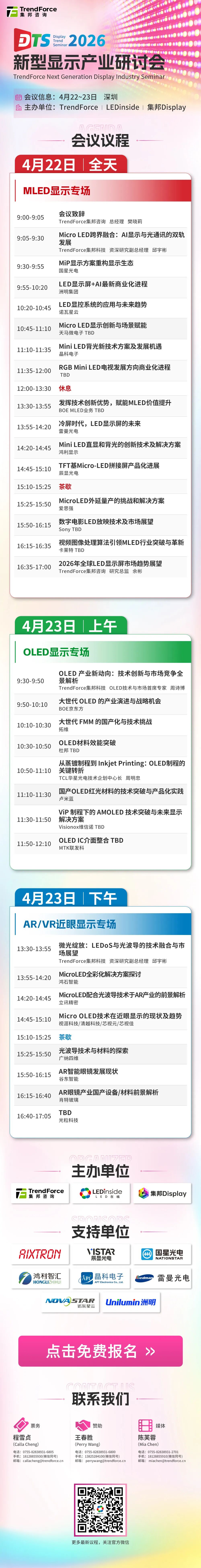 LEDinside整理免费报名2026新型显示产业研讨会(DTS),共同解码MLED、OLED发展。4月22-23日深圳见!