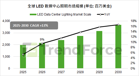在生成式 AI (Gen AI) 与全球数字化转型的双重驱动下,庞大的算力需求正全面改变数据中心的建设与运营模式,特别是超大规模(Hyperscale)数据中心已成为投资建设的主力。TrendForce 观察指出,过去在数据中心建设总成本中占比不足2%的照明系统,如今在严苛的PUE(电力使用效率)监管政策与零碳排放趋势下,如新建数据中心PUE被严格限制在1.3或1.4以下,数据中心照明已从被忽视的环节跃升为实现绿色低碳目标不可或缺的关键一环。在AI算力扩张与LED照明渗透率提升的共振下,数据中心照明市场成长动能强劲。TrendForce最新数据显示,2025年全球LED数据中心照明市场规模达19.7亿美金,预计2026年将进一步扩大至21.6亿美金,年增率达9%,至2030年,该市场规模有望成长至36.9亿美金,2025至2030年复合增长率高达13%。从区域来看,北美受惠于庞大的存量替换与系统升级需求,稳居全球最大市场;而亚太地区在政策引导及中国、印度、东南亚等地的数字经济投资拉动下,正进入新一轮建设高峰,成为成长动能最为突出的区域。数据中心关键设施需7x24小时不间断运行,对灯具可靠性的要求远超一般商照。为满足极致的能效要求,主流LED灯具光效已普遍提升至160 lm/W以上,以有效降低照明热负载对制冷系统的压力;同时需具备超过10万小时的长寿命,并采用4000K-5000K冷白光及高显色性以利于线缆辨识。此外,随着“无人机房”模式普及,支持红外或微波感应调光的智能灯具已成为标配,按需照明正加速渗透。在庞大的市场机遇下,全球数据中心照明产业已形成多层次的竞争格局。如Signify 通过旗下Cooper Lighting及Interact物联网平台,提供涵盖 LiFi 无线技术与定制化设计的全生命周期服务,稳固其高端生态市场。Acuity Brands 则凭借强大的智能边缘战略,将照明深度嵌入楼宇管理系统架构,确立了其在北美市场的行业地位;Zumtobel 以 TECTON 连续线槽系统为核心,强调高度模块化、免工具安装与卓越光品质,深获高端托管及形象导向型数据中心青睐;LEDVANCE 则侧重以标准化线型灯具提供的通用替换方案;PacLights 专攻存量市场的高 ROI 改造,以磁吸套件和灵活调光设计满足低成本维护需求。TrendForce 认为,数据中心照明系统已日益融入整体基础设施架构。未来,具备跨系统整合能力与与绿色产品(EPD)认证的头部大厂,将在高端市场持续扩大影响力;而专注存量改造、提供灵活改造方案的厂商亦将稳占一席之地,市场专业化分层趋势将愈发清晰。更多LED照明市场深入行情,欢迎了解TrendForce集邦咨询出刊的报告《2025全球LED照明市场趋势-数据资料库与厂商策略》。免费报名2026新型显示产业研讨会(DTS),共同解码MLED、OLED发展。4月22-23日深圳见!