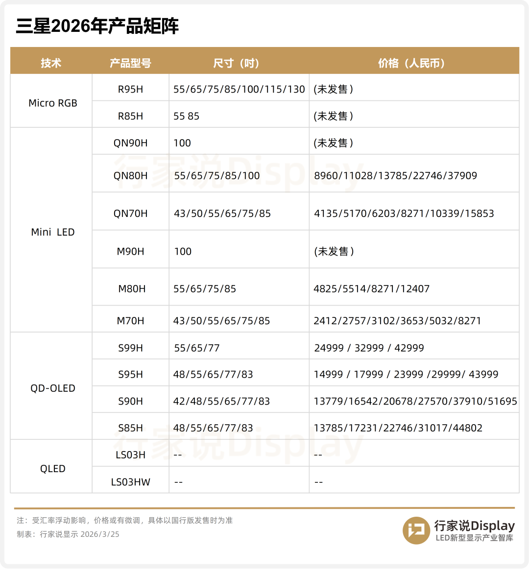 三星2026 电视产品线已在 CES 2026 发布,覆盖QD-OLED、Micro RGB、Neo QLED、Lifestyle (QLED)艺术电视四大技术路线。与2025年相比较,三星整体技术布局变动不大,不过也逐渐向Mini LED技术倾斜。Micro RGB方面,2025年仅有的100和115两个尺寸,2026年布局了55-139英寸,并将其定位为旗舰机型。Neo QLED方面,增加了入门级机型,最低可至2499元,砍掉量子点、简化配置,主打性价比的同时,也使得产品分层更加明显。QD-OLED方面,主要变化在于技术升级,采用第五代 QD-OLED + Penta-Tandem 五层叠构,进一步提升产品亮度与小时效果。可见,在产品定位上,三星高端产品价格维持,Neo QLED 2026 与 2025 价格完全一致,坚守利润。而入门产品大降价,新增M 系列,三星Mini LED 价格带首次下探到2500元档。第二个消息是三星计划在5月关闭斯洛伐克工厂,而其原因之一,是将欧洲产能转移至波兰、匈牙利工厂,降低制造成本,提升效率。在这背后是三星所面临的困境——全球电视需求低迷,中国品牌低价冲击。反映在财报上,是三星VD营业利润连连走低。2024 年三星VD实现了超 10 万亿韩元级盈利,自2025年Q3起,三星VD开始了亏损,2025全年亏损约2000亿韩元(约合人民币9.3亿元)。而在另一方面,TCL电子电视业务营收同比增长8%,海信视像营收同步增长7%。在Mini LED放量、大屏化、全球化与中高端化策略下,中国品牌市占率逐步爬升。与中国品牌对比,三星在欧美核心区域具备稳固的品牌与渠道电视,在北美、西欧等区域,三星份额超40%;但同时因三星供应链外采,难以在中低端市场打出高性价比。TCL则具备全产业链+规模优势,可推进产品快速迭代,目前挑战在于高端市场积累不足,待索尼与TCL电子股权转让完成,有望进一步扩大其在欧美市场的影响力。海信主打技术深耕与差异化路线,推动RGB-Mini LED电视发展,体育营销赋能,在全球化路线下,也加速布局,在日本等市场实现快速发展。在市场角逐之下,当前三星仍然选择持续稳固中高端市场,以利润优先,重构产品矩阵,收缩低效产能,聚焦高附加值的市场。行家说Research认为:目前全球电视市场已进入中韩双雄争霸、日系几乎全面退出的格局,一边是坚守高端、收缩产能、力图守住利润与份额王座的三星;另一边是凭借全产业链、差异化技术与全球化布局实现量价齐升、持续紧追的中国头部品牌。三大品牌在出货规模、技术路线、高端化进程与全球渠道上正面交锋,行业格局从过去的一家独大,快速转向多强争霸,三星全球第一的位置正面临前所未有的压力,而中国品牌的崛起已是不可逆的产业趋势。跳出参数战,三星The Wall站稳豪宅LED高端赛道三星、LG公布2026年RGB-Mini LED电视阵容