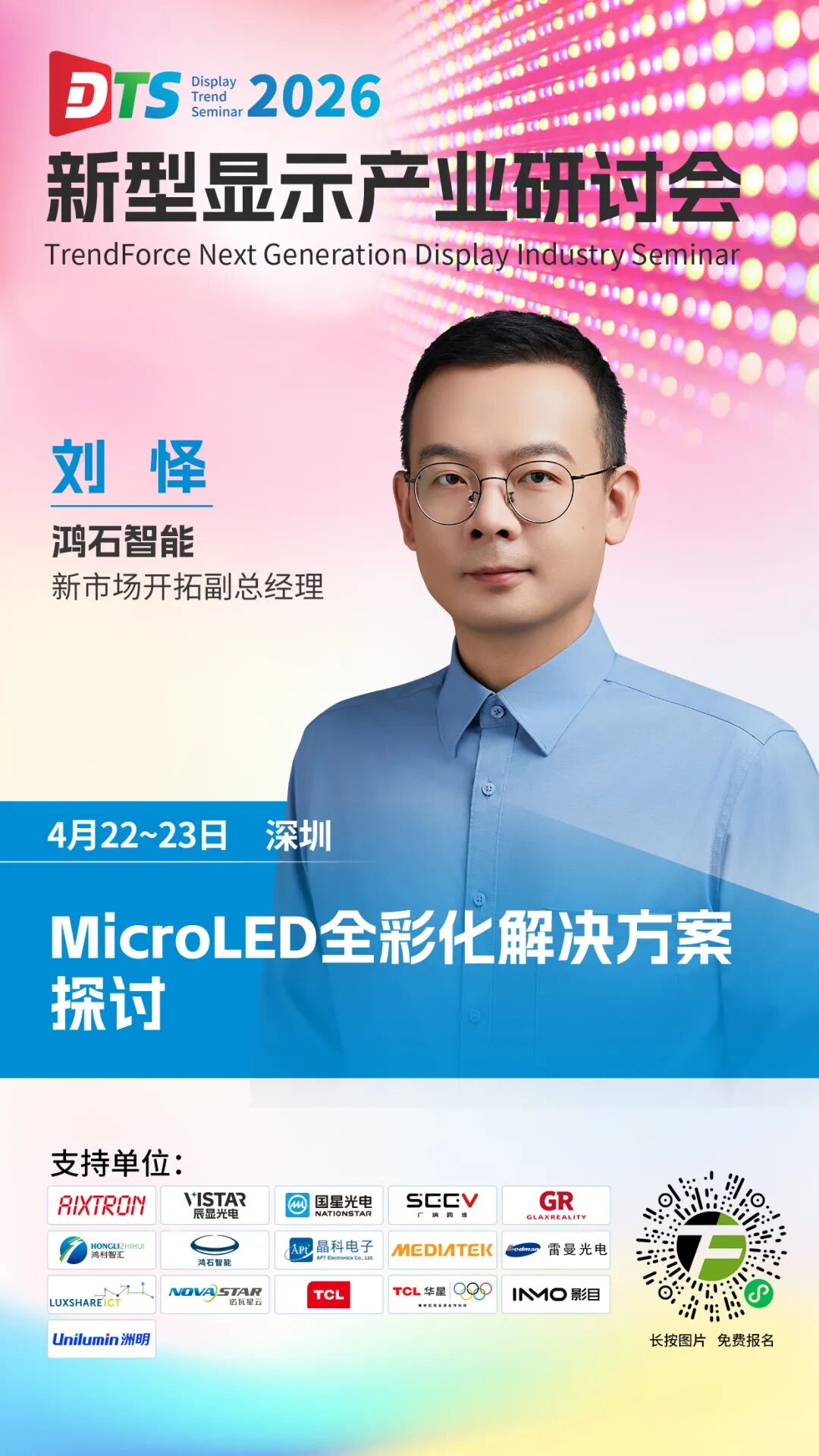 全彩仍然是Micro LED AR产品的关键卡点,鸿石智能全彩方案也在加速落地当中。在4月22-23日举行的2026新型显示产业研讨会(DTS)上,鸿石智能新市场开拓副总经理刘怿将以“MicroLED全彩化解决方案探讨”为主题,分享鸿石智能在这一领域的最新布局及进展。