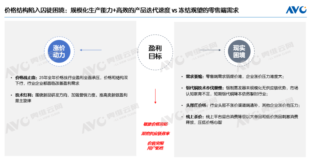 2026年一季度的空调市场,在经历了年初短暂的政策刺激与消费复苏的“小阳春”后,未能延续回暖态势。春节后市场终端零售压力凸显,行业再次步入“阴跌”通道。奥维云网(AVC)推总数据显示,2026年2月空调零售量233万台,同比下滑25.3%,零售额78亿元,同比下滑23.7%。奥维云网(AVC)最新发布的排产数据显示,2026年4月国内空调总排产量同比下滑9.4%,其中内销排产同比降幅达到6.8%,外销也在多重因素影响下同比下滑12.6%。排产数据无疑给旺季即将到来的空调市场泼了一盆冷水。当前行业正面临着一场前所未有的“极限拉扯”:一边是高企的库存和待推广的新品,另一边则是终端需求疲软、价格战酝酿中的现实困境。在这场博弈中,企业如何在提结构与保份额之间寻找平衡点,将成为决定全年市场走向的关键。作为空调核心原材料的铜材,其国内市场价格在2026年3月出现回调,近两周自10万元/吨上方回落,最低触及9.2万元/吨,周度跌幅超过5%。受国际地缘冲突影响,避险资金从有色板块流出,转向原油及化工,推动塑料等相关原料价格上涨,空调整体成本压力有所缓解。从基本面看,当前铜现货库存仍处高位,尽管国内需求表现强劲,去库存启动后降幅明显,但在市场交易情绪转向宏观与地缘主导的背景下,基本面更多体现为对期货结构的支撑,仅凭国内需求难以对市场情绪形成持续影响。叠加美元走强、降息预期降温对有色金属估值的压制,企业考虑铜价后市偏弱放缓排产节奏。盈利导向高压下的“囚徒困境”:涨价动力与现实阻力并存