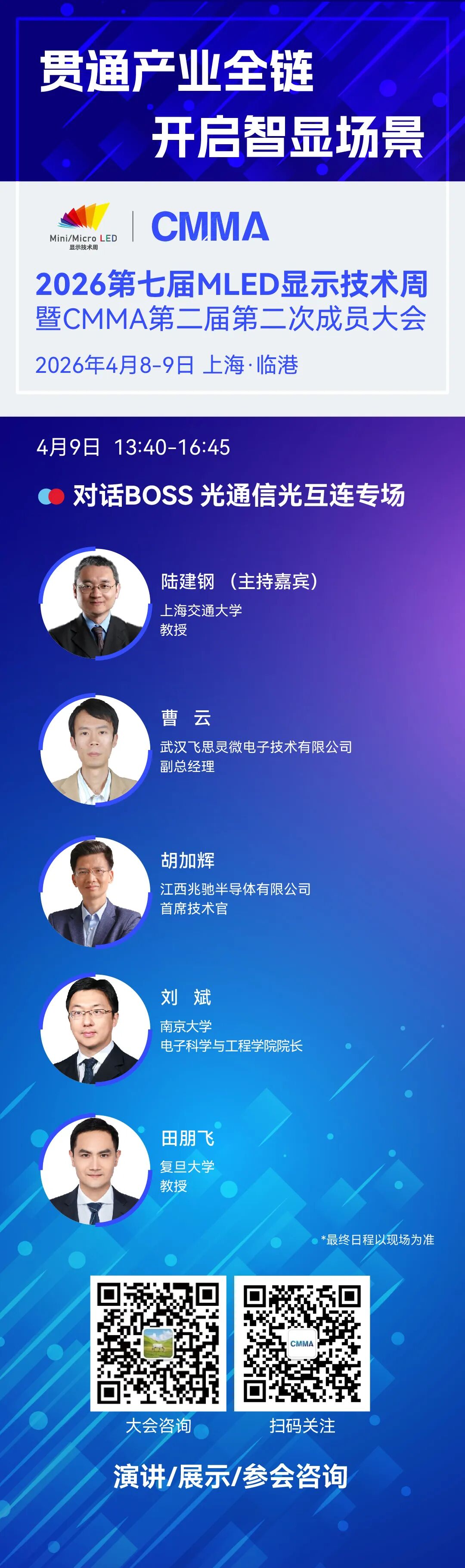 (点击上方图片查看)值得关注的是,近期MicroLED光互联领域密集传来重大进展:微软、联发科、欧司朗、Avicena、Marvell相继披露相关布局,加上此次Mojo Vision的新一轮融资,产业风向已清晰可见——高密度MicroLED阵列正在从技术验证走向规模化应用,有望成为下一代AI数据中心互连的核心方案。随着AI算力集群规模持续扩张,光互连技术的演进路径正变得愈发清晰。当激光器方案的物理极限逐步显现,MicroLED以其高密度、低功耗、可扩展的独特优势,正成为产业链共同押注的方向。而如何从器件突破走向系统成熟,如何打通从芯片设计、封装集成到数据中心部署的完整链条,仍需要产业各方的深度协同与持续探索。2026年4月8-9日,2026第七届MLED显示技术周将在上海临港召开,期间将举办对话BOSS 光通信光互连专场,汇聚邀请来自学术前沿、LED芯片、光通信光模块芯片的核心力量,共同搭建显示与光通信的跨界对话平台。重磅议程出炉!百位大咖,直显/微显示/车载/背光/光互连五大赛道,这场MLED技术周将定义“人车家商业”全场景