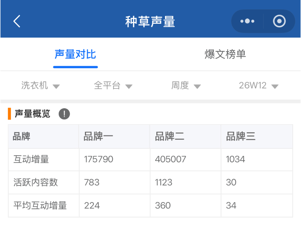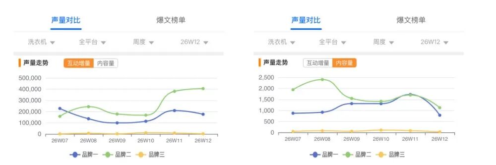 在 2026 年第 12周(2026年3月16-22日)洗衣机全平台(抖音+小红书平台)种草声量监测中,三大核心品牌表现呈现显著分化:点击图片进入小程序—点击“爆文榜单”—免费注册查看详情↓品牌二:以 40.5 万互动增量领跑行业,活跃内容数达 1123 条,单条内容平均互动增量 360,实现内容规模与传播效率双第一,声量优势显著。 品牌一:互动增量 17.58 万,位居第二,活跃内容数 783 条,平均互动增量 224,内容传播力稳定,与小天鹅形成双强格局。 品牌三:互动增量仅 1034,活跃内容数 30 条,平均互动增量 34,声量表现大幅落后,本周市场声量存在感极弱。从周度互动增量趋势来看,品牌二自26W11 起迎来爆发式增长,单周互动增量突破 38 万,26W12 持续攀升至 40.5 万,呈现持续上行的强势增长曲线,用户关注度持续走高;品牌一互动增量整体呈波动下行后回升态势,26W07 达 23 万峰值后就逐步回落,26W11 开始回升,随后保持稳定。从活跃内容数维度看,品牌二内容量始终领先,26W08 达 2400 条峰值,后续虽有回落,但 26W11 仍维持 1700 条高位;品牌一内容量整体平稳,内容量呈稳步增长后回落态势,26W11 达 1700 条峰值,随后回落。