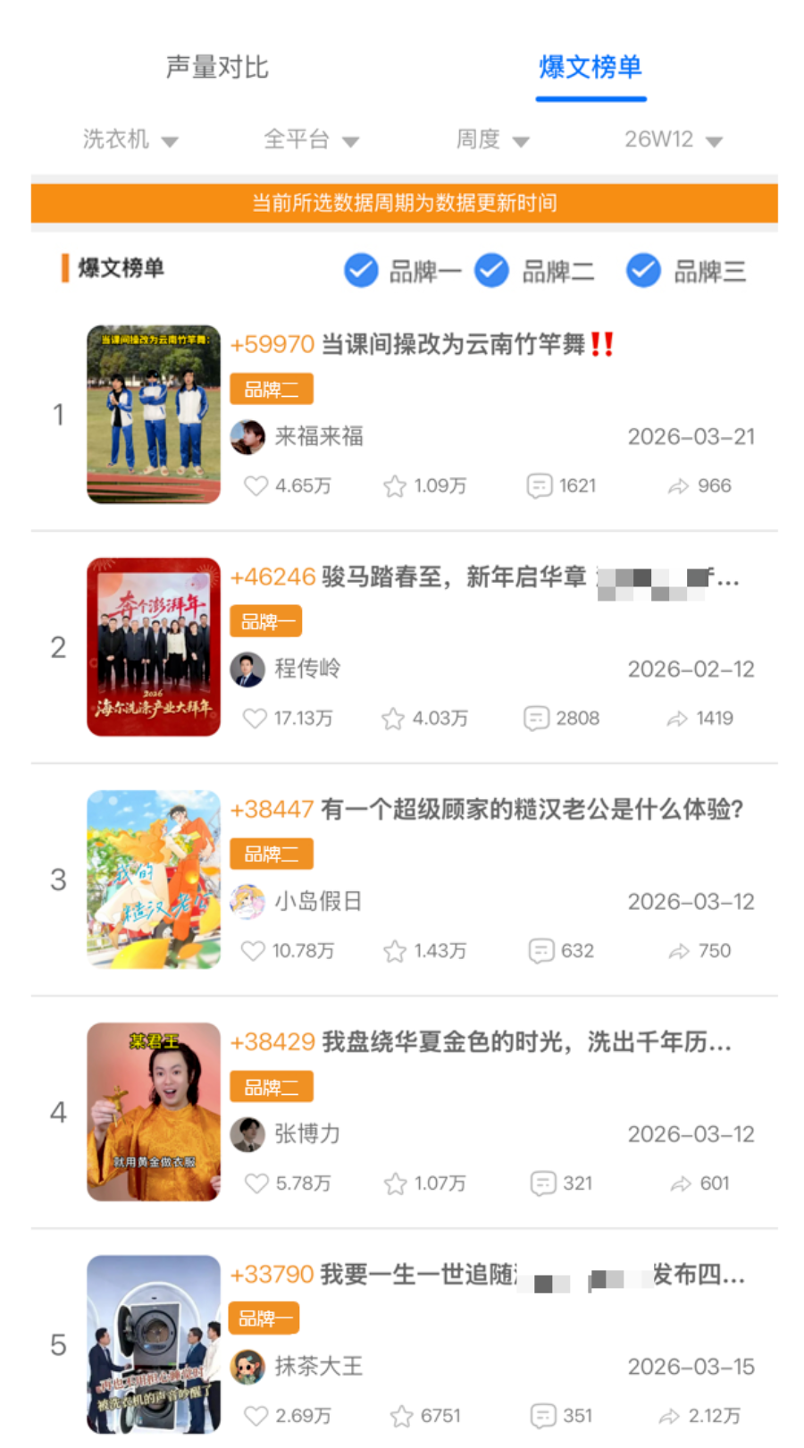 周报 | 2026年第12周洗衣机种草声量