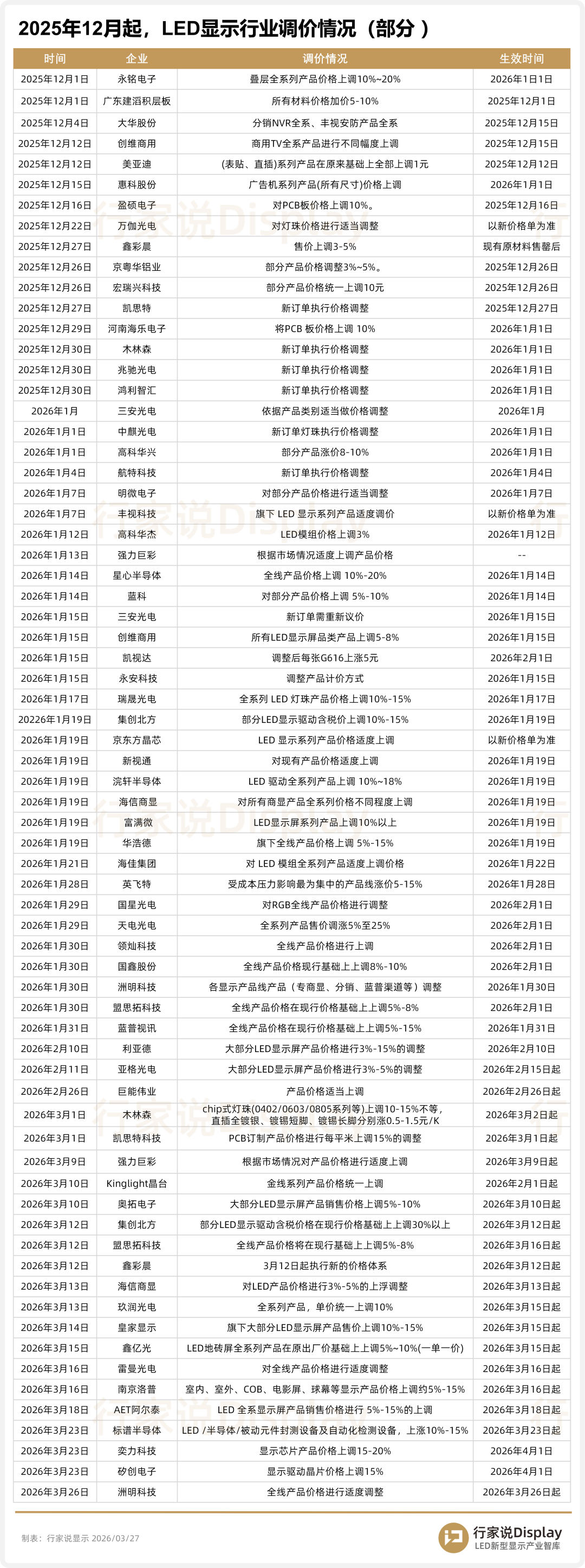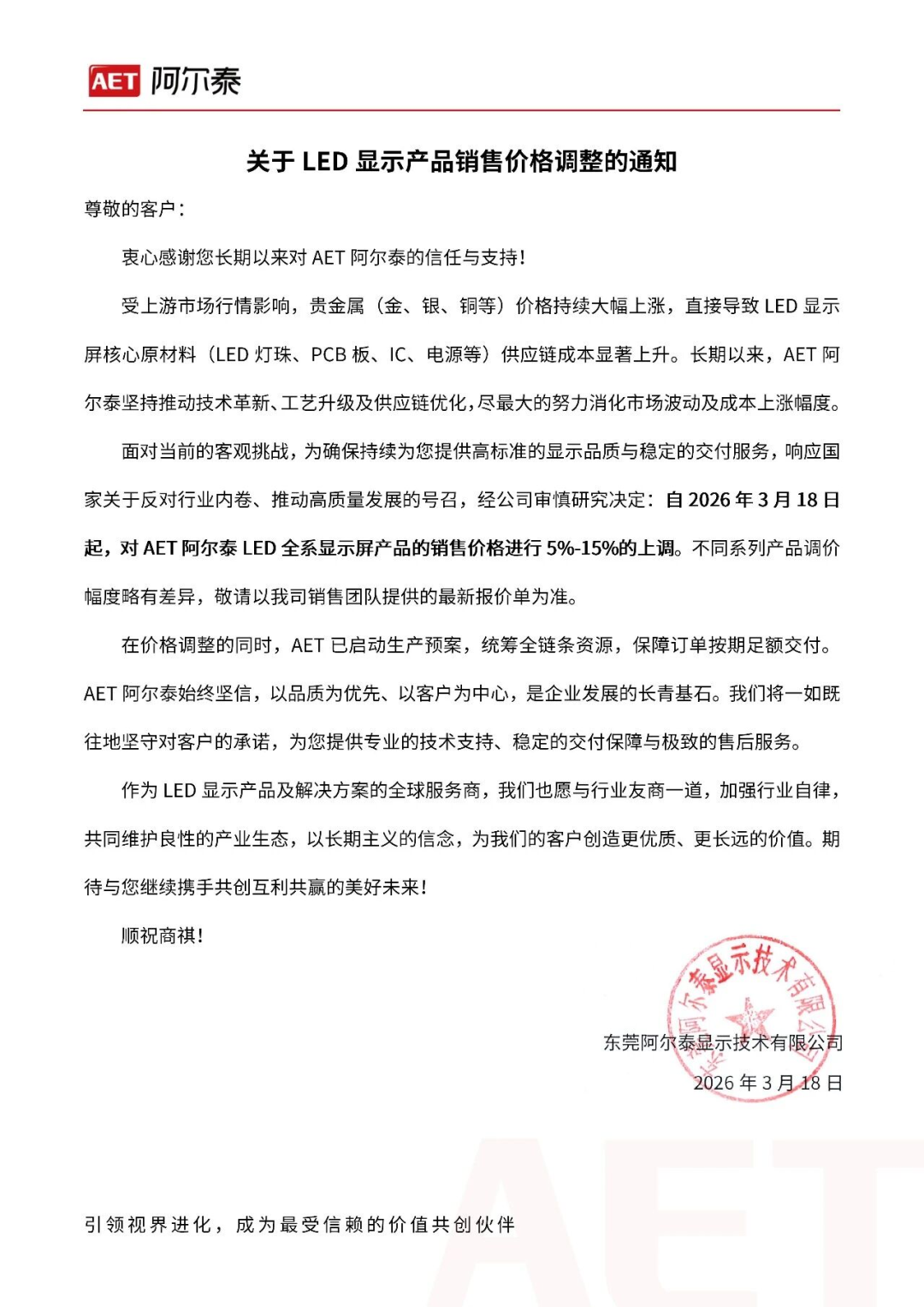3月26日,洲明科技发布关于产品价格调整的通知函表示,近期,受原材料价格大幅上涨的影响,企业核心材料的采购成本已显著增加。尽管企业已通过内部优化尽力消化部分压力,但为了确保持续提供高品质的产品,保障服务质量的稳定,经公司审慎评估,自2026年3月26日起,将对全线产品价格进行适度调整。具体执行标准将以企业最新发布的报价单或专属销售人员的通知为准。在此日期之前已确认的订单,仍按原价格执行。3月18日,AET阿尔泰发布关于LED显示产品销售价格调整的通知。 通知显示,受上游市场行情影响,贵金属(金、银、铜等)价格持续大幅上涨,直接导致 LED 显示屏核心原材料(LED灯珠、PCB板、IC、电源等)供应链成本显著上升。面对当前的客观挑战,为确保持续为您提供高标准的显示品质与稳定的交付服务,响应国家关于反对行业内卷、推动高质量发展的号召,经公司审慎研究决定:自2026年3月18日起,对 AET阿尔泰LED全系显示屏产品的销售价格进行5%-15%的上调。3月23日,深圳市标谱半导体股份有限公司发布价格调整函,企业表示,近期,受全球供应链激烈变化的推动,原材料成本持续攀升、大宗商品价格波动加剧、核心零配件大幅度普涨等因素影响,导致设备生产成本显著上升。经过公司审慎评价,决定对所有产品实施价格调整。本次价格调整自2026年3月23日零时起实施。具体调整方案如下: 1、全系列产品:LED 封测设备、半导体封测设备、被动元件封测设备以及自动化检测设备,在原价格基础上上涨10%-15%。2、2026年3月 23 日之前已签合同尚未发货的,按原合同价格执行。3、2026年3月 23 日之后新签订合同请联系我司销售负责人询价。3月23日,奕力科技发布显示驱动芯片调价通知涵。企业表示,面对2025年第三季度起国际局势变动,导致金、铜等半导体原物料价格持续答复上涨,导致企业显示驱动芯片产品生产成本持续显著增加,企业虽致力于内部成本优化,但生产成本涨幅已超出负荷范围。为确保后续能稳定供应高质量产品,经慎重研议,将针对显示驱动芯片产品进行价格调整:1、生效日:2026年4月1日,本次价格调整生效后,所有新接订单将按调整后价格执行。3、具体型号与定价:以自生效日起公布的官方报价单为准。3月23日,矽创电子发布价格调整说明,企业表示,近期半导体产业供应链出现结构性成本上涨,经本公司审慎评估,相关成本压力已逐步传导至整体知道体系,价格调整具体细节如下:
