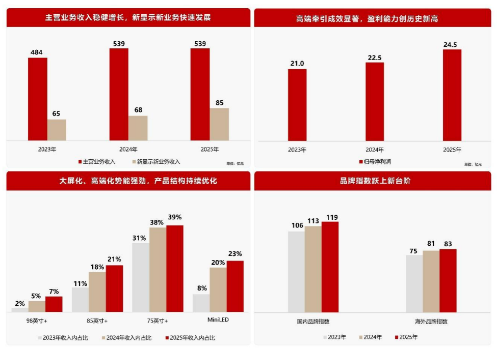 2025年,艾比森实现营业收入约 41.58 亿元,同比增长 13.53%,归属上市公司股东净利润为 2.52 亿元,同比增长115.47%;扣除非经常性损益后的净利润为2.30亿元,同比增长202.90%。从数据来看,艾比森业绩全面向好,在营收稳健增长的同时,实现了利润的倍增,且盈利质量和运营效率均显著提升;且海外稳增态势良好,国内逆势突围。具体来看,艾比森海外市场实现营业收入约为31.78 亿元,同比增长约 8.41%。国内市场在LED 显示整体需求疲软的背景下,通过聚焦优质客户、优化产品结构、调整渠道策略等关键举措,实现营业收入 9.81 亿元,同比增长 34.02%,成功实现逆势增长。面对国内外不同市场环境,艾比森也通过灵活调整战略,力图在新的经济形势下持续优化资源配置和市场结构,实现业绩可持续的高质量增长。产能方面,艾比森在2025年LED显示产品销售量达413,581.11平方米,同比增长16.26%;生产量同比增幅更高达37.56%,为销售增长提供了支撑。研发投入上,艾比森2025年度研发费用为1.84亿元,近五年累计研发投入已达7.54亿元。过去一年,艾比森在多个国内外大型项目中落地了其显示解决方案,包括交付全球最大的COB弧形屏、点亮全球最大单体虚拟影棚、为越南国庆80周年庆典提供超2000平方米显示大屏,并为2025年第十五届全国运动会提供近1000平方米核心显示系统。在产品端,艾比森推行的“大单品”战略收获市场反馈。其中,A25产品平台在2025年度签单金额突破10亿元;新产品NT V2自上市后4个月内销量即达10万台。▋ 海信视像:新显示新业务实现主营业务收入84.58亿元2025年,海信视像实现营业收入576.79亿元,归母净利润24.54亿元,同比增长9.24%;经营活动产生的现金流量净额45.83亿元,同比增长27.43%。2025年,海信视像坚定不移推进“高端化、大屏化、智能化”战略,主营业务收入稳健增长,第二曲线新显示新业务表现亮眼。报告期内,新显示新业务实现主营业务收入84.58亿元,同比增长24.92%,成为公司重要增长引擎。在产品结构方面,大屏化、高端化趋势成效显著。2022年至2025年,海信视像电视产品平均尺寸从50.44英寸增长到53.63英寸,65英寸及以上产品销售额占比从44%提升至56%,75英寸及以上产品销售额占比从21%提升至39%,98英寸及以上产品销售额占比从1%提升至7%。同时,Mini LED产品出货量显著增长,销售额占比从2%提升至24%,有效驱动国内及海外品牌价格指数稳步增长。技术创新方面,海信视像自主研发的ULED高端显示技术平台实现跨越式升级,RGB-Mini LED技术引领行业进入“光色同控”时代。在巩固核心业务优势的同时,海信视像积极布局激光显示、商用显示、Micro LED、AI机器人、芯片等新兴领域,第二增长曲线加速成型。其中,商用显示业务实现爆发式增长,全年收入同比增长265%,业务覆盖87个国家,交互平板全球出货量位列第二、海外第一,数字标牌、LED显示业务海外增速分别达53%和48%,在教育、会议、零售等场景形成差异化竞争优势。Micro LED领域,海信视像构建全产业链垂直整合能力,推出全球首款通过EMC Class B认证的PM驱动Micro LED产品,并在2026年CES展上首发163吋四基色(RGBY)Micro LED产品。另外,海信视像战略控股信芯微、乾照光电,构建中大尺寸全显示芯片矩阵。2025年,电视TCON芯片全球市占率约45%,显示器TCON市场占比提升至约12%,笔记本电脑TCON领域实现批量突破,Mini LED背光芯片业务营收同比增长约70%。2025年,乾照光电实现营业收入34.01亿元,同比增长39.78%;归母净利润为1.15亿元,同比增长19.32%。报告期内,乾照光电聚焦核心业务,不断丰富市场拓展策略;同时,新领域业绩取得较大突破。其中,背光业务在控股股东的积极牵引下,公司自研的高性能RGB-Mini LED背光芯片已在海信等终端电视客户中实现应用,并创新推出搭载第四种天青色自发光芯片的“玲珑4芯”方案,叠加Mini COB多层氧化物控光及Mini RGB混排技术,驱动背光业务营收同比增长70%以上。此外,车载业务的多场景应用持续布局,交付规模持续扩大,驱动车载业务营收同比增长170%以上;太阳能电池业务持续技术突破与产品升级,产能及交付能力稳步提升,出货量同比增长30%以上。核心技术方面,乾照光电与控股股东协同自研全球领先的高性能RGB-Mini LED背光芯片,全球率先推出三维控色显示技术,并在此基础上,进一步攻克RGB三色背光芯片倒装三维钝化技术,芯片老化寿命提升200%,且高压芯片实现稳定量产,助力海信视像率先推出COB RGB 三色高端背光电视,有力巩固在高端背光领域的技术与市场优势。Micro LED商业化进程显著提速,Micro MIP芯片获行业头部企业量产认证并开启小批量出货;应用于大屏及智能穿戴产品的Micro COG芯片取得技术突破,正推进国际客户认证;针对车用与AR等增量市场,Micro LED像素车灯性能升级接近国际一流水准,AR微显示芯片技术持续迭代并具备5μm以下制程能力。VCSEL数据光通信方面,10G/25G产品完成送样,预计2026年形成正式订单并交付;50G/100G产品已进入流片阶段。Micro LED光通信方面,积极与高校、企业开展产学研合作,针对性开发多款专用芯片,已进入送样验证阶段。2025年,中微公司实现营业收入123.85亿元,同比增长36.62%;实现归属于母公司所有者的净利润约21.11亿元,同比增长约30.69%。中微公司主要为集成电路、LED 外延片、功率器件、MEMS 等半导体产品的制造企业提供刻蚀设备、薄膜沉积设备、MOCVD 设备及其他设备。目前,中微公司在Micro-LED 和