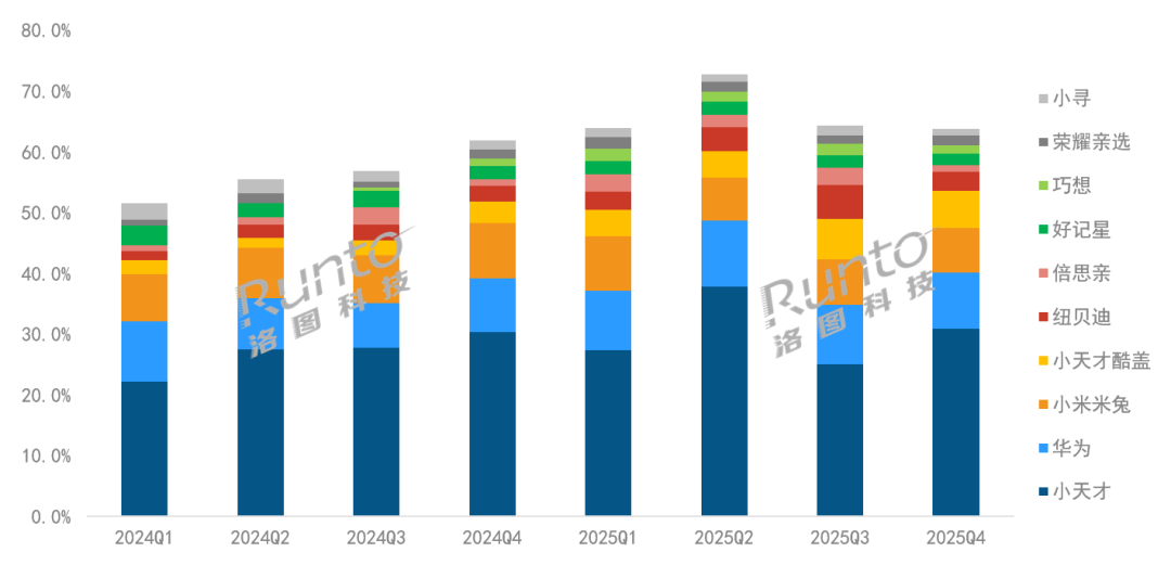 根据洛图科技(RUNTO)数据显示,2025年,在中国线上市场,小天才以30.3%的销量份额强势领跑;2024-2025年分季度的市占率稳定在两成以上,并显著领先于其它企业,核心优势便源于此。