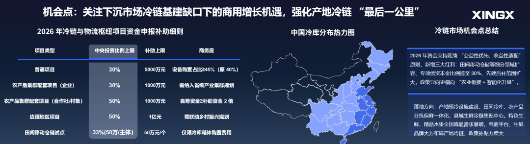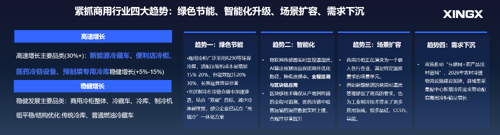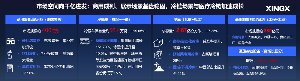 2026年3月18日,第四届星星商用冷链生态大会在海南三亚举行。本次会议聚焦行业前沿,以星星冷链百项工程案例沉淀经验,以冷链场景解决方案勾勒蓝图,以服务生态升级夯实根基,解码冷链产业的未来增长新路径。奥维云网(AVC)副总裁何金明受邀出席,并进行了《商有道集大成,聚力共赴星辰》的主题分享。2025 年中国家用制冷产业整体承压,其中冰箱市场规模 1271 亿元、同比下滑 11.5%,冰柜市场规模 102 亿元、同比下降 6.4%;而商用制冷赛道逆势增长,据奥维云网摸排统计,2025年我国商用冷柜零售市场规模约 900万台,同比增速 4.5%,台量规模稳步扩张。在此行业分化格局下,星星冷链凭借精准的战略布局交出了逆势增长的亮眼答卷:2025年星星出口同比增长10%,实现十年连增,规模从3000万美元跃升至近3亿美元,全球化布局成效显著。当前商用制冷市场正加速迈向千亿规模,整体呈现传统场景稳健盘底、新兴赛道全面爆发的增长格局。商用冷柜/展示柜作为终端零售的核心基础盘,市场规模约400亿元,其中饮料冷柜为最大增量引擎,便利店冷柜持续向大容积方向升级,高端专用柜以高增速领跑细分品类;冷藏车领域,新能源车型渗透率大幅提升,成为行业增长核心动力;冷库领域,高标自动化冷库、预制菜专用冷库、中西部下沉冷库成为核心增长引擎,带动行业容量持续扩容,成长空间广阔。十五五开局之年,冷链物流定位升级,政策与资金支持力度空前2026年作为十五五开局之年,冷链物流被正式升级为国家战略基础设施,政策与资金支持力度空前为商用制冷产业提供了良好的发展环境。根据资金扶持政策汇总,超长期特别国债首批已下达936亿元、带动总投资超4600亿元,中央预算内投资给予最高50%的专项补助,地方政府专项债预计发行规模达4.8万亿元,再叠加财政金融协同的统筹支持,整体形成了万亿级的资金池,重点投向冷链设施更新、技术改造、产地预冷与城乡冷链网络完善等方向。然而,行业当前仍存在三大结构性瓶颈:一是区域分布不均,超60%的冷库集中在东部地区,中西部基础薄弱,呈现东强西弱的格局;二是标准等级不高,高标冷库占比不足三分之一,且多集中于核心枢纽城市,大量农贸市场仍为非标准设施,设备落后、能效偏低;三是运营效率低,多数冷库由房东或二房东粗放运营,仅以收租为目的,未深度嵌入供应链全流程,导致服务同质化、库容利用率低迷。在政策强力托底的背景下,下沉市场冷链基建缺口已成为商用制冷领域的核心增长引擎。2026 年国家延续公益性优先、收益性适配的资金支持原则,针对冷链与物流枢纽项目出台梯度化补助细则,万亿级资金池持续向基建补短板倾斜。目前,中西部县域等下沉市场仍存在显著基建短板,产地冷链最后一公里建设需求迫切。落地方向明确聚焦产地预冷设施、田间冷库、县域生鲜冷链集配中心等核心环节;叠加特色生鲜、精品水果全国流通需求激增,电商与生鲜品牌加速布局产地冷链。多重利好共振下,商用制冷行业已迎来确定性增长机遇。当前商用制冷行业品类表现呈现明显结构性分化:新能源冷藏车、便利店冷柜等赛道实现高速增长;医药冷链设备、预制菜专用冷库保持 5%-15% 的稳健增速;商用冷柜整体、冷藏车及冷库等主力品类平稳发展;传统冷库与常规燃油冷藏车则逐步进入结构优化调整阶段。商用制冷产业正围绕绿色节能、智能升级、场景扩容、需求下沉四大主线加速迭代升级。绿色节能领域,R290 环保冷媒、光伏制冷等技术加快普及应用,在能效提升与低碳发展目标下释放长期价值;智能化方面,物联网监控、AI 算法优化、区块链全程溯源等技术深度渗透,尤其在医药冷链场景显著提升运营效率与合规水平;场景扩容上,商用冷柜持续向多行业定制化场景延伸,新能源、半导体、氢能等新兴领域也为工业制冷打开全新增量空间。整体而言,行业正依托技术升级与市场下沉实现结构性增长,高增长赛道与稳健品类协同发力,为商用制冷企业带来多元化的发展机遇。奥维云网原创文章,未经授权,禁止任何机构或个人抓取本文内容,用于训练AI大模型等用途。