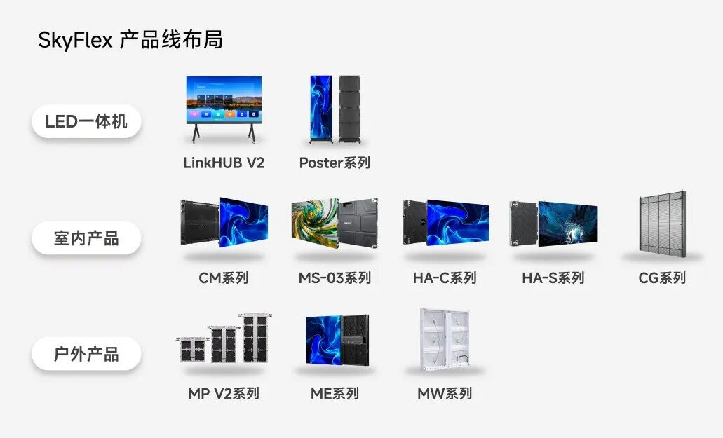 - 子品牌(SkyFlex):则化身“特种部队”,专注于高端固装领域,产品线全面覆盖LED一体机、室内固装及户外固装,提供针对性解决方案;并通过独立的品牌形象、差异化的产品逻辑(如主打TCO优势而非低价)以及专业化的服务体系,垂直穿透特定场景。