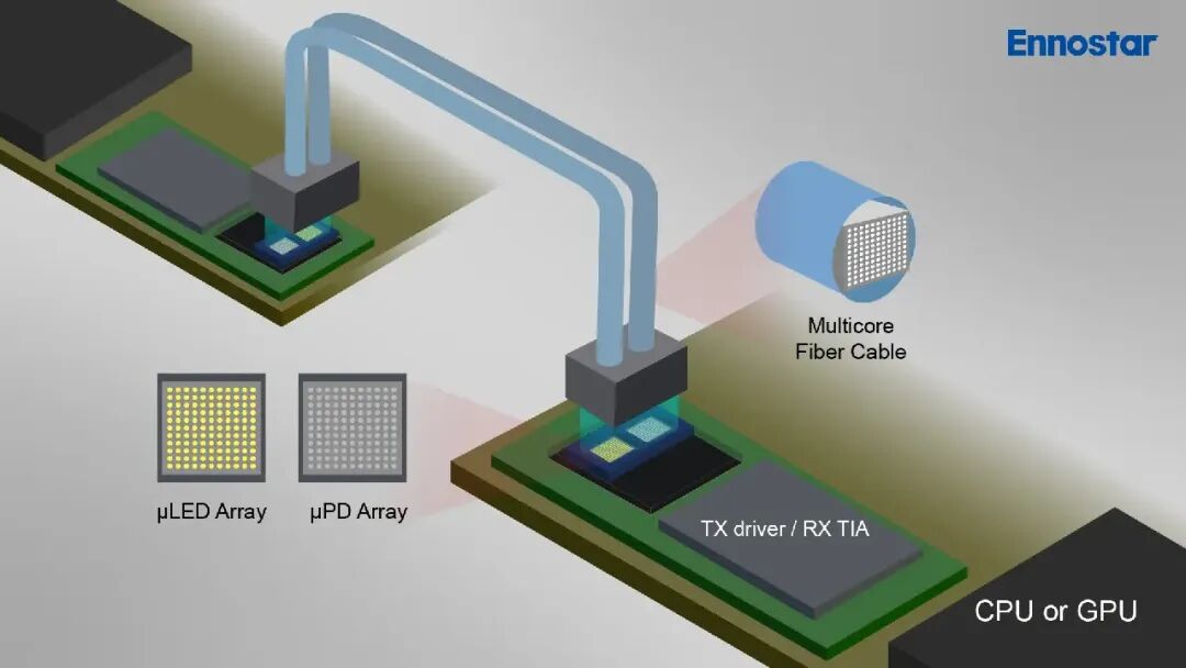 4月1日,富采控股宣布,旗下企业富采光电将在Touch Taiwan 2026展会中,与友达光电、鼎元合作展示Micro LED应用于AI高速光通信的技术成果。该方案采用富采Micro LED光源与鼎元Micro PD,整合于友达的共封装光学(CPO)模组,主要针对数据中心10米内的短距离高速传输场景,适用于共封CPO及主动式光缆(AOC)高速互连。从技术参数来看,Micro LED光源具备高温稳定性(125°C)、长寿命(30,000小时)以及较低功耗(低于1 pJ/bit)等特性。根据富采方面的信息,目前已完成通道1.25 Gbps Micro LED元件验证,下一阶段将持续提升调制速率与可靠度。除Micro LED外,富采同时布局VCSEL与以磷化铟为材料的CW-DFB 雷射两项光通信光源技术。在100米内的短距离应用中,富采与传承光电合作展示100G QSFP28 SR4光收发模组;针对2000米内的中长距离传输,富采推出以磷化铟为材料的连续波分布反馈式雷射(CW-DFB),可支持800G OSFP DR8收发器。