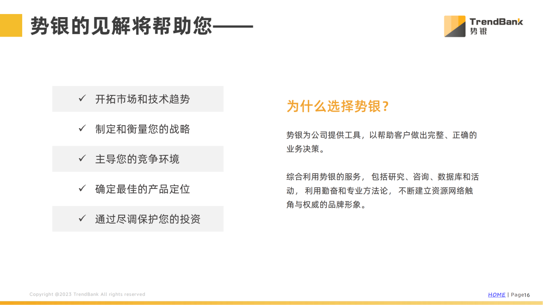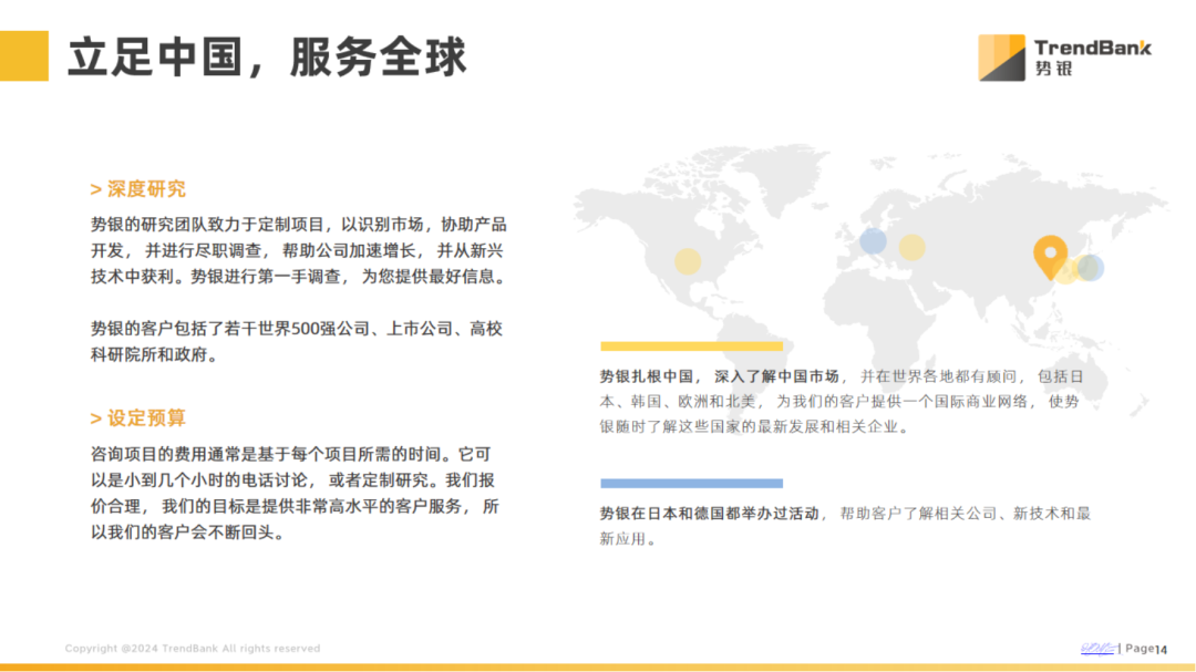 势银(TrendBank)的咨询顾问经常出差,参加许多会议、拜访许多大学和公司,为你学习和解答最新的信息。如果您的需求无法通过我们的研究产品得到满足,专门定制的咨询项目会是更好的解决方案。
