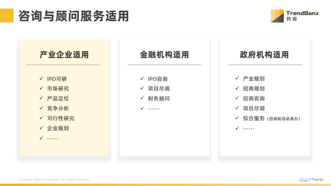 产业企业适用:IPO可研、市场研究、产品定位、竞争分析、可行性研究、企业规划等; 金融机构适用:IPO咨询、项目尽调、财务顾问等;