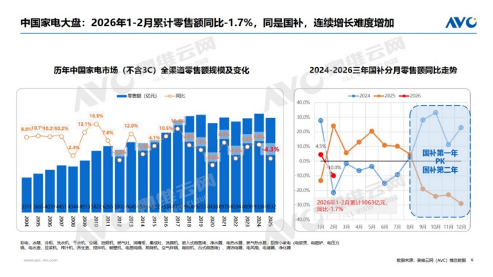 当前家电行业正处于传统红利退潮、结构重构的关键期。从宏观基本面来看,全球人口突破80亿持续增长,而中国人口达14亿已出现下行拐点;叠加结婚登记、出生人口同步下滑,房地产红利显著减退,传统燃油车、房地产、低端消费电子等多个行业步入负增长区间。但危机中亦有新机:独居人群、老龄化群体、陪伴经济三大赛道快速扩容,成为消费市场新支撑。聚焦到家电大盘,奥维云网(AVC)推总数据显示,2026年1-2月中国家电(不含3C)全渠道累计零售额1063亿元,同比下降1.7%,行业持续增长压力加剧,竞争核心从政策红利转向产品创新与场景穿透力。