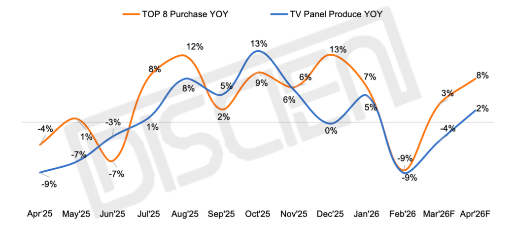 需求端:步入4月,美加墨世界杯赛事前夕,欧美终端零售仍存在产业链条库存的去化动力;中国市场则仍处于国补政策提前透支后的市场修复期,且在存储涨价的成本压力下,中国头部品牌也随之调整相应策略,以京东渠道来看,头部品牌下架50寸及以下小尺寸产品,基本以55寸作为起步产品,变相推动需求往55寸及以上主流大尺寸产品聚焦,因此近期大尺寸需求存在一定加量。中国品牌二季度采购需求仍相对强劲,但由于国际品牌在中国市场规模有限,且海外赛事备货也基本收尾,当前节点下,针对二季度采购需求有所下修。根据DISCIEN《全球TV面板供应链关系月度数据报告(+3M)》统计数据来看,三月份TOP8采购总量同比增长3%,四月份同比增长8%。
