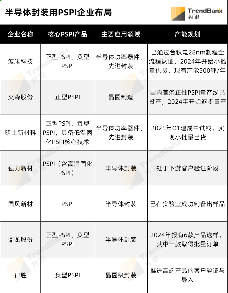 国内PSPI企业的布局主要集中于半导体封装用PSPI和显示面板用PSPI两大核心赛道,前者是先进芯片封装的“卡脖子”核心材料,后者是OLED柔性屏量产的关键配套材料。不同企业基于自身技术积累,分别在对应赛道实现了技术突破,甚至产业化落地,具体进展如下: