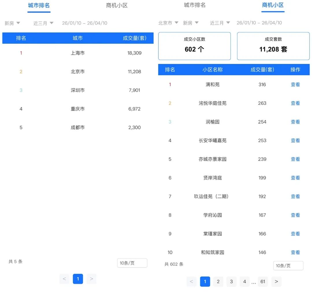 房屋交易数据就可以给出答案,该板块覆盖了北京、上海、广州、深圳、重庆、杭州新房及存量房小区数据,包含关注城市内具体小区名称及小区成交量,后续将会上线更多城市。