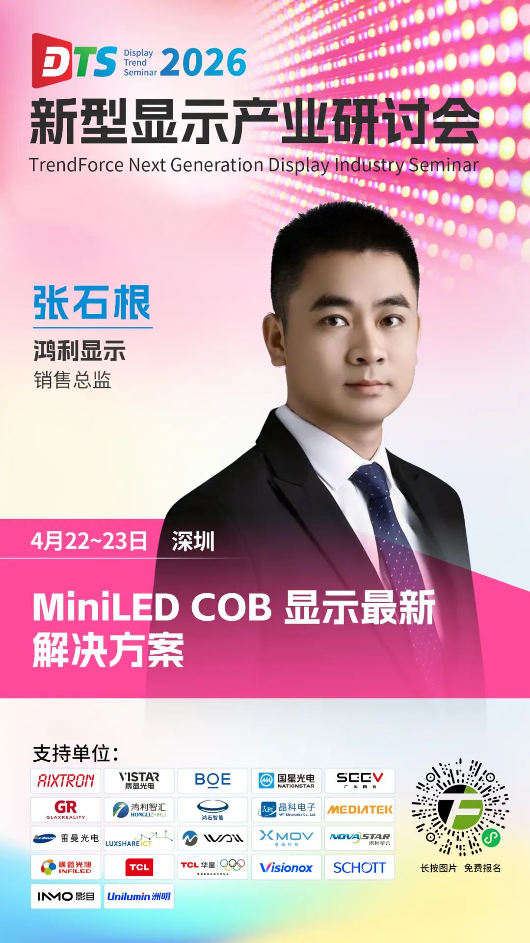 在4月22-23日举行的2026新型显示产业研讨会(DTS)上,鸿利显示销售总监张石根将以“MiniLED COB 显示最新解决方案”为题展开分享,敬请期待。