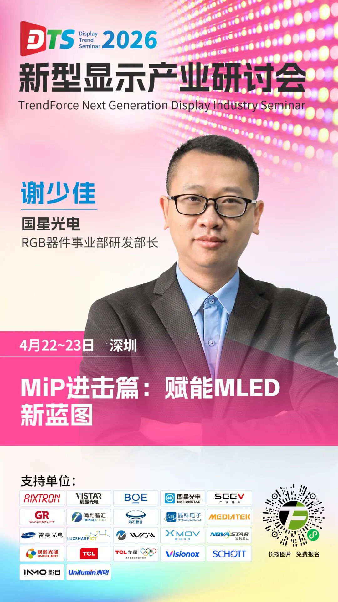 在4月22-23日举行的2026新型显示产业研讨会(DTS)上,国星光电RGB器件事业部研发部长谢少佳将以“MiP进击篇:赋能MLED新蓝图”为题展开分享,敬请期待。