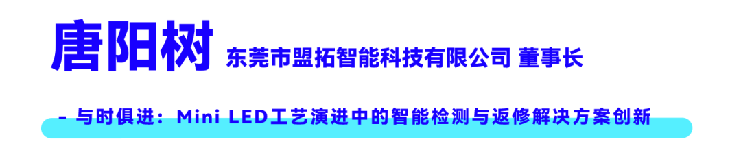 盟拓智能董事长唐阳树先生提到,盟拓运用AI技术实现Mini LED全工艺链的智能检测与返修创新。通过AI精准定位芯片、识别外观瑕疵及数据复判,大幅降低误报率。针对背光与直显产线,提供从焊盘检测、3D锡膏测试、炉前炉后AOI、点亮测试到在线自动返修的一体化方案。其自研的视觉检修一体化软件平台具备灵活模块化架构,可适应工艺演进,并已拓展至MIP检测、半导体封装等领域,助力客户提升品质与效率。