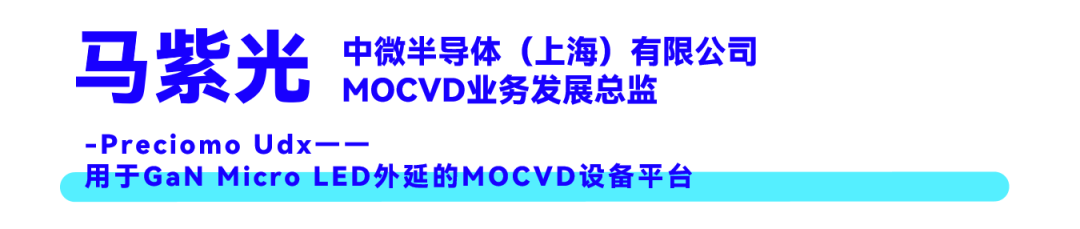 中微公司MOCVD业务发展总监马紫光先生指出,Micro LED外延的瓶颈在于对波长均匀性与颗粒物控制的极致要求,Micro LED芯片仅15-30μm,需将波长均匀性压缩至小于0.5nm、颗粒物尺寸小于0.5μm。中微公司发布的全新MOCVD平台Preciomo Udx,通过三重独立控温、水平层流设计、全自动传输及氯气清洁工艺,实现了厚度均匀性小于0.5%、波长均匀性小于0.5nm、颗粒密度低至0.2颗/cm²。同时,单腔可容纳9片6寸或6片8寸晶圆,总占地面积仅25.3㎡,显著降低外延成本,为Micro LED上游量产提供了关键设备支撑。