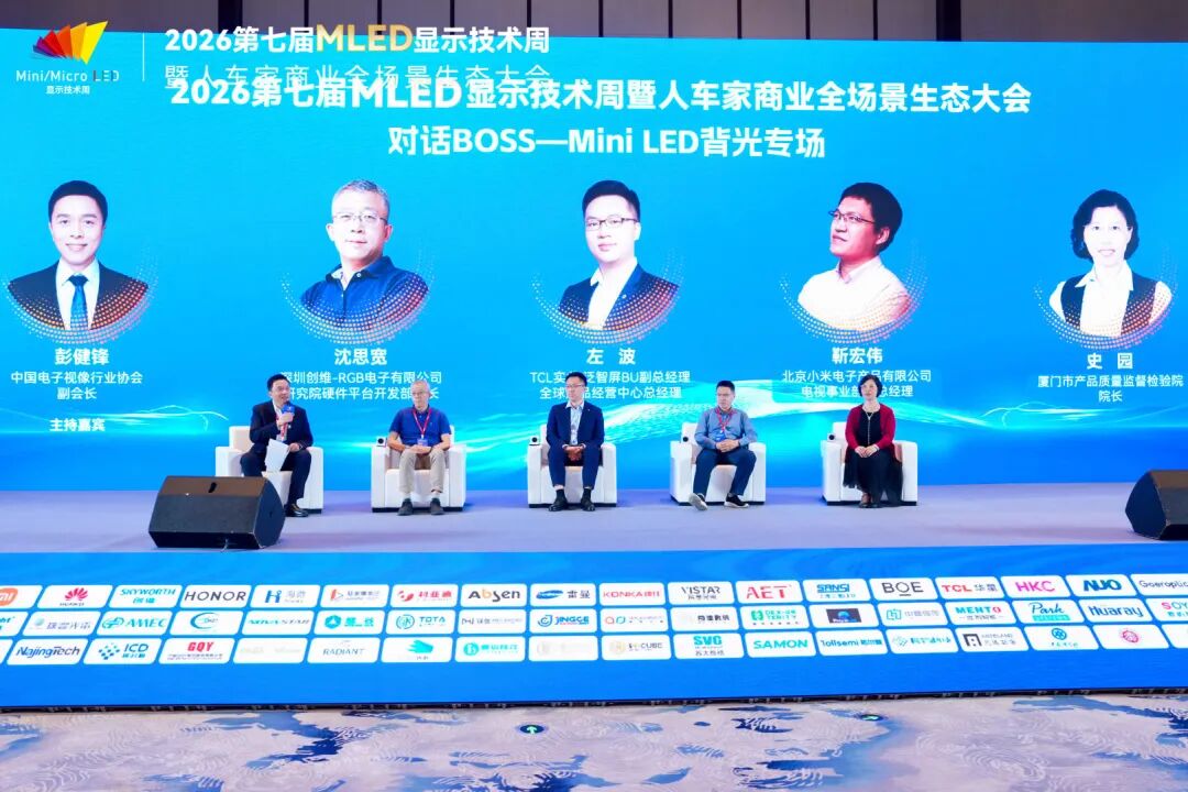 对话BOSS Mini LED 背光专场由中国电子视像行业协会副会长彭健锋主持,TCL 实业泛智屏 BU 副总经理、全球产品经营中心总经理左波,北京小米电子产品有限公司电视事业部副总经理靳宏伟,深圳创维 - RGB 电子有限公司研究院硬件平台开发部部长沈思宽,厦门市产品质量监督检验院院长史园参与对话。