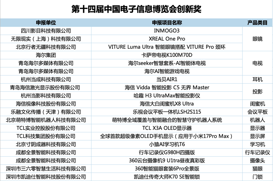 大会最后重磅发布了“中国电子信息博览会创新奖”榜单。中国电子视像行业协会名誉会长郝亚斌、中国电子信息博览会秘书长陈雯海为获奖企业的代表颁发了证书。该奖项是由中国电子信息行业创新评选组委会联合电子信息领域专家学者、协会、媒体等权威人士和机构评选,旨在向产业的创新者致敬,推动打造代表我国电子信息行业的更高创新水平。