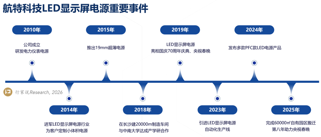通过分析航特科技近16年的发展发现,其能实现渠道突围,不是一蹴而就的,而是分了三个关键阶段。2014到2017年,是LED渠道屏爆发的风口;强力巨彩等头部品牌大举推进全国渠道下沉,带动户外产品向SMD升级,洲明科技也将P2.5小间距推向渠道市场,整个渠道市场需求持续放量。正是在这一时期,航特科技果断聚焦渠道屏专用电源,2014年正式切入LED显示屏电源市场,次年便推出19mm超薄电源产品,通过标准化超薄电源适配渠道主流需求,深度绑定头部屏厂,成为核心供应商,借产业扩张红利快速突围,筑牢渠道基本盘。该阶段,LED显示屏渠道市场波动明显,竞争日趋白热化,价格战加剧、利润持续压缩,此时屏厂在选型时对产品稳定性、性价比要求提升。对此,航特科技又着力推进了两项关键工作。首先是扩产能。航特科技于2018年在长沙建成 20000㎡现代化生产基地,月产能跃升至80万台,为规模化供货与稳定交付打下基础。而目前企业已完成 60000㎡自有产业园区搬迁,产能再上台阶。其次升级产线。2023年航特科技引入LED显示屏电源自动化生产线;目前从贴片到包装实现全过程自动化生产,关键工序做到100%自动化作业,LED电源产品100%全检,单台产品下线仅4秒,出厂产品返修率控制在0.5‰以下。调研中,航特科技表示,电源售后维护成本是电源产品本身价值的10倍以上,因此“极致稳定”成为其产品生产的核心准则。综合来看,通过规模化生产与自动化升级,航特科技持续提升渠道价格竞争力,同时以稳定可靠的品质,成为屏厂放心的“成本安全垫”。3、2024年-2025年,紧密追踪需求,持续迭代产品这一时期,渠道市场产值有所收缩,但行业对电源的要求却越来越高。该阶段,航特科技以市场需求为研发核心,持续推出适配行业趋势的新品。如随着节能政策落地,航特科技在2024年推出多款PFC款LED电源产品;同时,面向小间距LED、COB封装对小体积、高功率密度、低纹波的需求,企业也推出转换效率高达93%的LED显示电源、满足IP67高防护等级的亮化电源、高效PFC款LED电源产品等。不仅如此,2025年企业已启动AHB(不对称半桥)谐振半桥技术在LED显示电源领域的研发储备,计划通过技术迭代进一步压缩产品体积、降低生产成本。从结果来看,航特科技将近40%渠道市占率,这一成绩的取得,是其从准确判断行业风口,到构建高性价比、高稳定性的产品体系,再到紧密贴合市场需求,持续推进产品迭代演进,这一系列关键环节环环相扣、层层夯实的结果。面对2026 年,航特科技也在不断拓展新发展方向。据行家说Display了解,其除了持续深化渠道下沉外,还加速海外市场开拓,并着力培育场景化电源,构建新的增长点。同时,除显示电源外,企业也在亮化照明、工业控制及新能源等领域不断发力,以实现多元竞争力。今年LED显示屏产业出海趋势明显,航特科技也在通过积极参与国际行业展会、扩充本土化销售团队等措施,持续提升海外品牌影响力和市场渗透力。此外,依托年产1500万台、年出货近1000万台的产能,也可乘中国渠道屏品牌出海东风。近几年,随着一体机、虚拟拍摄、LED电影屏等新兴市场的发展,小间距和微间距LED显示屏仍是市场的主要推动力。而从 LED 显示屏电源市场来看,细分市场对电源性能的差异化需求日益凸显。基于这一趋势洞察,航特科技加速推进“场景化电源” 布局,在特定应用场景领域同步提供定制化电源解决方案。其中,针对LED电影屏领域,航特科技已推出 X4、X5(高 26mm)、M5(高 20mm)、T7、Q7 等系列电源产品,并实现客户对接与批量供货。另据《2025全球LED显示屏调研白皮书》显示,近三年,小间距、微间距LED显示屏产值一直在稳步增长,同时2025年P1.0以下间距显示屏产值增长明显。这意味着,LED显示微缩化进程仍在持续深化,未来还有很大的市场空间。而航特科技对场景专用、定制化电源产品的提前部署,也有望抓住这一市场机遇。