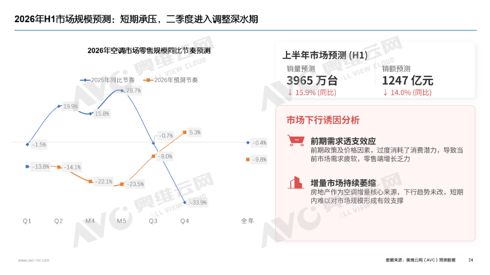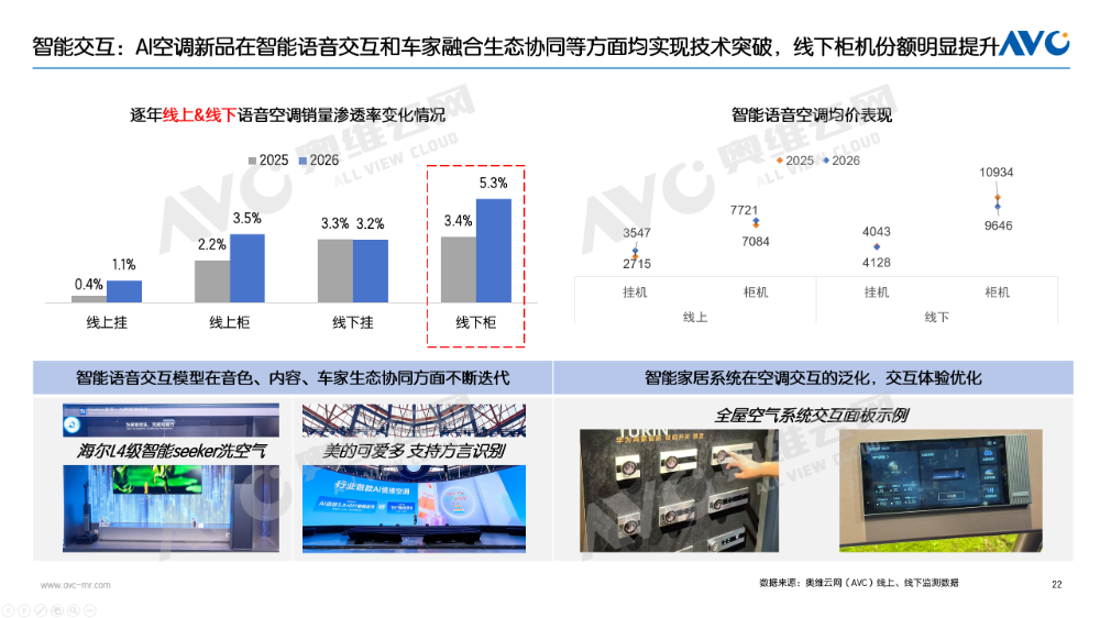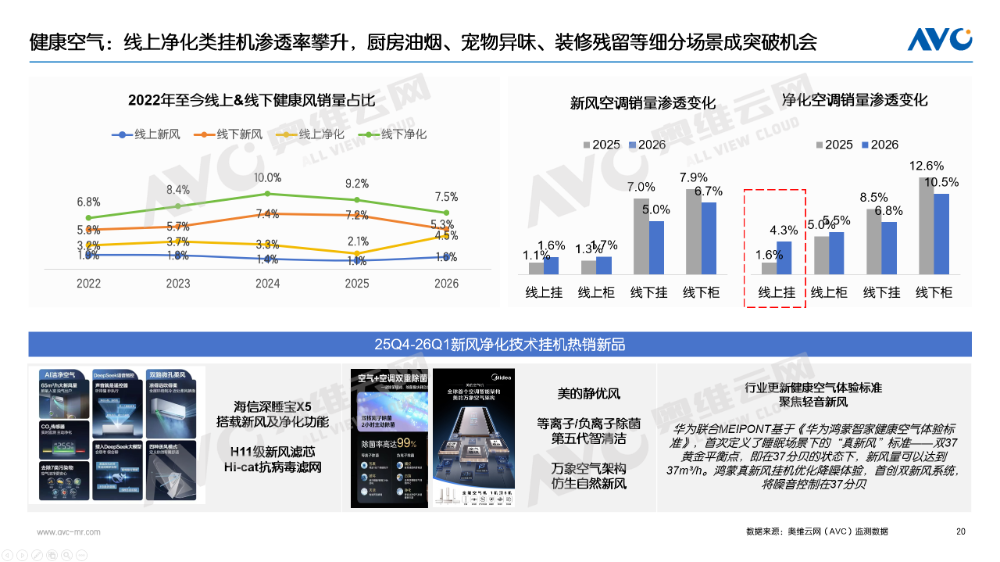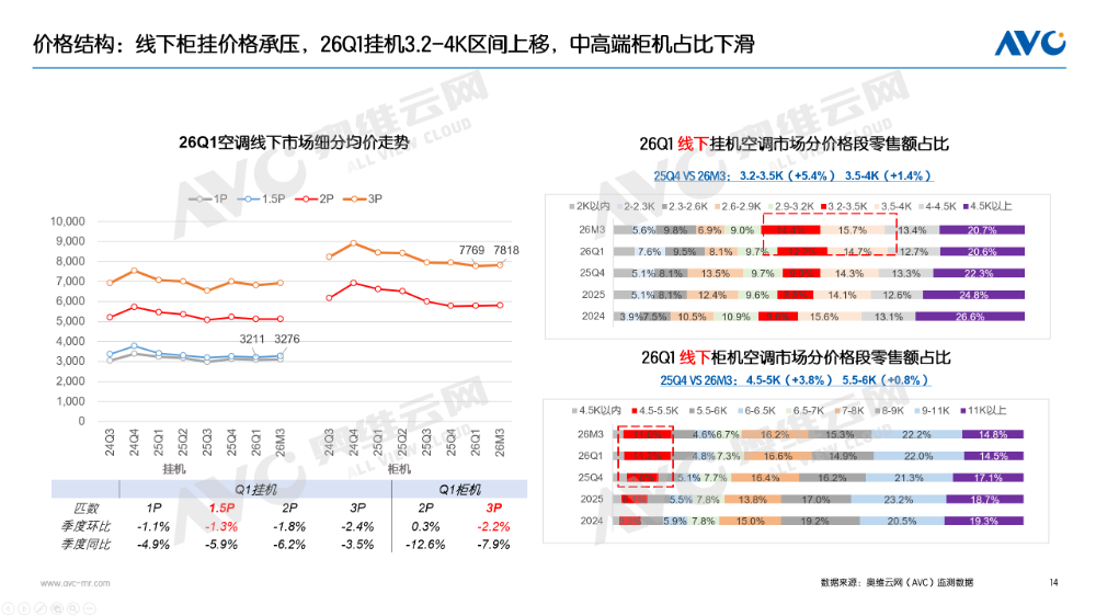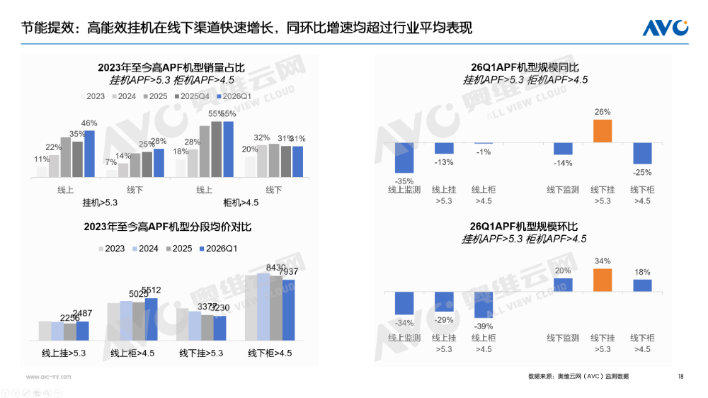 2026年第一季度,国内空调市场在经历“开门红”短暂回暖后迅速转冷。面对去年同期3台国补政策倾斜造成的高基数与当前消费信心的结构性回落,行业大盘陷入了量额齐跌的调整期。奥维云网(AVC)推总数据显示,2026年一季度,全渠道零售额同比下滑13.8%,零售量同比下滑13.0%。其中2026年3月份,全渠道零售额同比下滑17.3%,零售量同比下滑18.4%。从产销数据看,企业整体出货端也出现同样的下滑趋势。奥维云网(AVC)PSI监测数据显示,2026年一季度,销售同比下滑11.6%,其中内销同比下滑9.2%。当前整体库存仍处于相对高位,4月起零售端仍然面临较大的去库存压力。复盘企业财报利润率可以发现,2025年行业虽卷,但前期铜铝等大宗原材料价格的阶段性企稳,头部企业毛利率得以维持。而自2025年下半年以来,原材料成本压力持续上升,若零售价格无法顺利传导成本压力,仅靠压货维持的出货增长,将侵蚀Q2的经销商现金流与品牌利润空间。从零售表现看,2026年Q1的空调市场呈现出 “前高后低” 节奏,1月份在部分区域国补延续及企业开门红激励下,渠道打款提货积极,而进入3月,随着同期高基数效应显现、提结构遇阻,市场寒意显现。回顾2025年一季度,彼时有2024年双11冲刺期的“已销未提”收入确认红利,叠加2025年初国补启动,在3台补贴的红利刺激下爆发价格战,形成了同期销量高峰。因此,2026年3月销额同比接近两成的深跌并非市场突然崩盘,而是需求透支后的回调。从均价维度看,2026Q1的价格呈现出线上哑铃型、线下结构降级的特征。线上虽然同比去年价格战低谷有微幅攀升,但季度环比趋势持续下滑。具体到价格段,挂机两极分化,2K-性价比引流款份额显著扩大,2.9-3.2K的高端挂机份额增长;而在柜机品类,6.5-7K中端机和9K+高端机增长,中高端7-9K价格段占比明显缩水。整体看线上改善型需求正在萎缩,中间层的“舒适区”正在消失。线下渠道则呈现中端上移,高端缩水的特点。线下挂机在3.2K-4K区间占比有所上移,受成本推升及线下主推型号影响下,线下用户的预算正在被动提高。但在柜机市场,中高端机型占比同样出现下滑,消费者对大额支出的谨慎态度抑制了线下高端柜机需求。从品牌格局看,线上Top品牌份额出现松动,长尾品牌及子品牌份额增长显著。尤其是部分头部品牌的子品牌,凭借母品牌的品质与质保背书,以极致性价比在下沉市场获取份额,对二线品牌形成挤压。线下市场则进一步向头部集中,但头部内部的座次出现波动,部分头部品牌渠道政策放宽,通过对渠道政策的优化,允许渠道商少压货、调结构,终端份额明显回升。细分渠道看,以专业电商为代表的线上渠道均价同比提升,平抑去年同期价格战。而随着2026年国补力度与范围调整,线下门店对政策的依赖后遗症显现,渠道普遍反馈进店客流减少、用户预算降低。奥维云网(AVC)监测数据显示,2026年一季度大连锁和TOP渠道的均价同比分别下滑4.9%和4.7%。在全行业普跌的背景下,东北地区异军突起,尤其是黑龙江省,Q1规模同比暴增98.4%。这并非需求突变,而是旺季高温营销活动前置。由于2025年夏季高温频发,东北不少用户空调安装需求排不上,春季东北地区经销商提前启动营销抢占市场。这也提示行业,尽管大盘呈现疲态,但精准捕捉区域气候与消费节奏仍能挖掘增量。2026年,各大品牌纷纷加码AI智能、人感雷达、舒适风等概念,以求提升产品结构。而从短期市场反馈来看,产品卖点与用户痛点之间存在鸿沟。有零售渠道反馈,AI智能概念产品在下沉市场教育难度较大。消费者听不懂复杂的算法术语,导购员无法在短时间讲清AI省电与普通节能的本质区别,产品缺乏明确的利益落脚点。对于下沉市场消费者而言,制冷制热快、省电依然是核心决策要素,目前AI智能产品在推广过程中,存在理解难度高、缺乏可视化体验差异的问题。在规模承压的背景下,产品创新成为企业提结构、穿越周期的核心抓手。2026年一季度,五大产品趋势的渗透路径呈现出不同的渠道势能与技术成熟度差异。节能提效:高能效挂机线下增幅提升,电费焦虑驱动升级奥维云网(AVC)监测数据显示,高能效挂机在线下渠道实现快速增长,同环比增速均显著超过行业大盘。在消费降级电费敏感度提升的背景下,省电作为最朴素、最易感知的卖点,依然是驱动产品销售的最强动力。舒适风技术如无风感、双翼柔风、分区送风、风避人吹等产品的渗透正经历结构性迁移,早期舒适风技术更多应用于挂机,主打卧室睡眠场景。进入2026年一季度,舒适风技术在柜机品类的渗透率明显提升,场景从卧室延伸至客厅。针对老人、儿童等敏感人群,客厅柜机“冷风不直吹”需求被有效激活,也同步提升了柜机的溢价能力。新品通过毫米波雷达、星闪技术的降低端到端响应时间,实现人体位置、姿态等高灵敏度的舒适风感。格力、奥克斯、海信、长虹、TCL、海尔等品牌均在布局这一细分赛道,海信大力神空调U6及智慧风E5系列搭载的SLP星闪人感2.0技术,美的纤白二代,TCL小蓝翼毫米波雷达技术,长虹客餐厅AI人感空调,均从不同技术角度推动人体感知与送风逻辑的深度融合。健康空气的市场需求延续性明确,产品形态正加速向新风、除湿、加湿、除菌等复合功能聚合。值得关注的是,一季度线上净化类产品的渗透率正在攀升。技术端,融合电击与催化剂的离子净化方案已从商用领域向家用