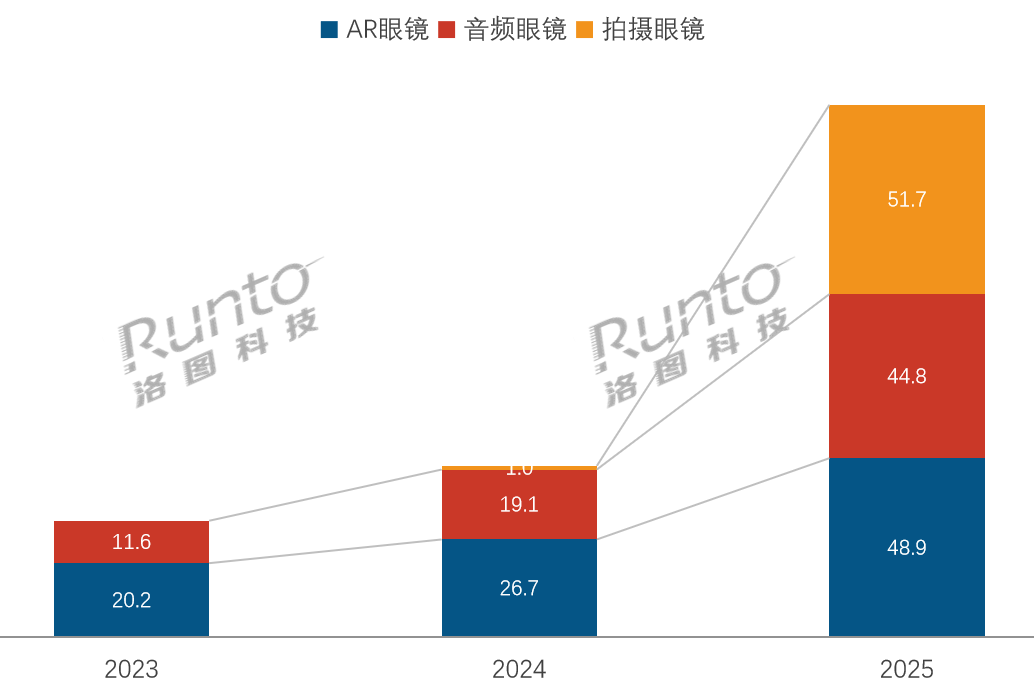 其中,拍摄眼镜表现尤为突出,大量跨界品牌的进入和华强北白牌的模仿,推动市场规模几乎实现了从零到51.7万台的突破。音频眼镜的销售量为44.8万台,同比增幅为134.6%。AR眼镜为48.9万台,同比增幅达83.2%,近乎翻倍。可见,各细分品类均形成了稳定的用户群。
