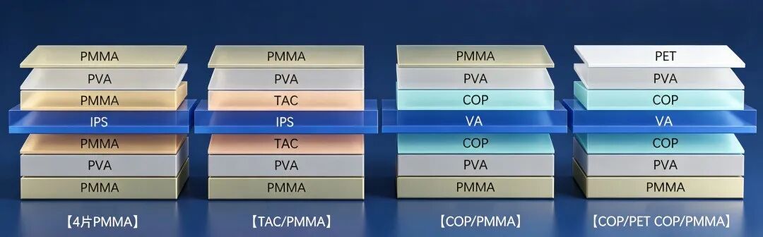 且传统偏光片中的上下两片TAC膜也开始转为依据面板实际使用情况的TAC膜、PMMA膜、COP膜、PET基(SRF)膜等膜材的组合应用。