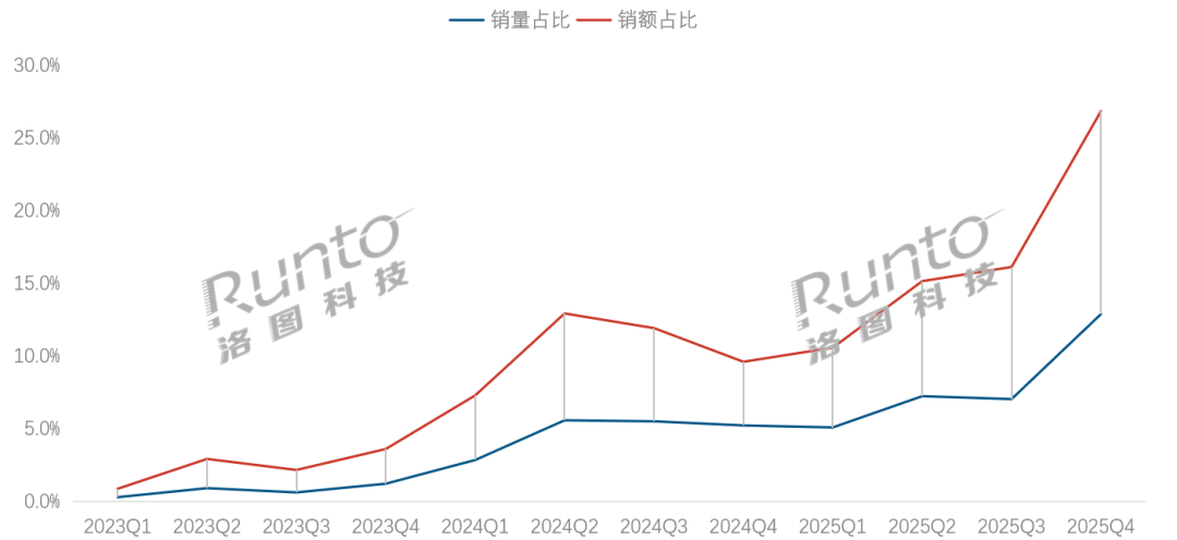 根据洛图科技(RUNTO)线上监测数据显示,中国1LCD智能投影线上市场中,500流明以上亮度产品的销量份额在2025年为8.0%,同比上涨3.2个百分点;在2025年第四季度则达到了12.9%。