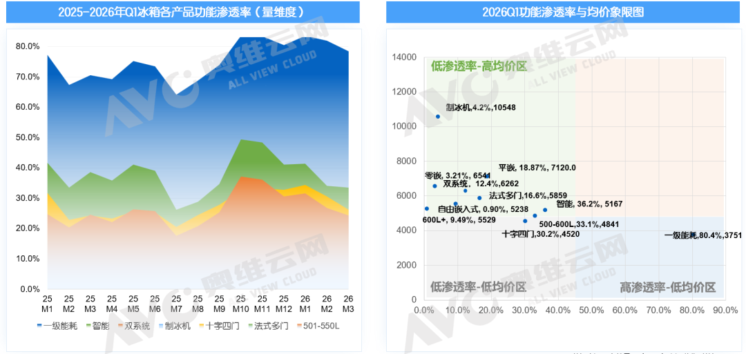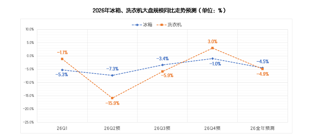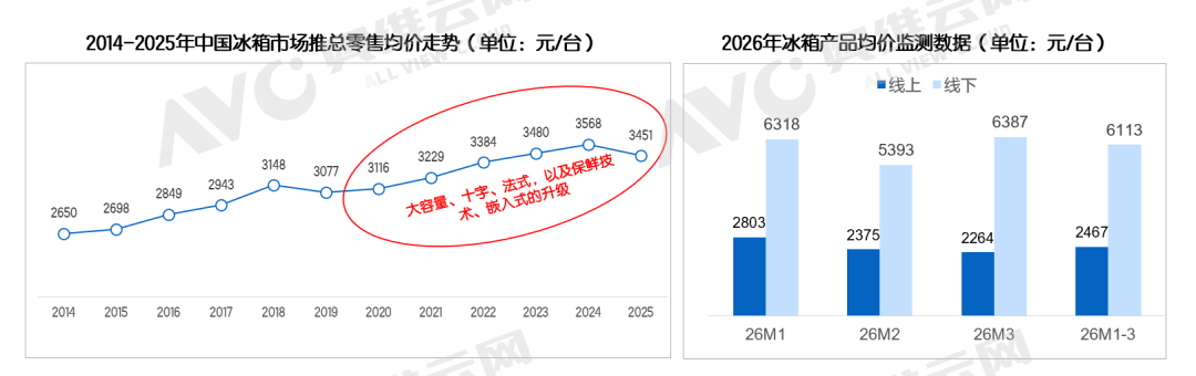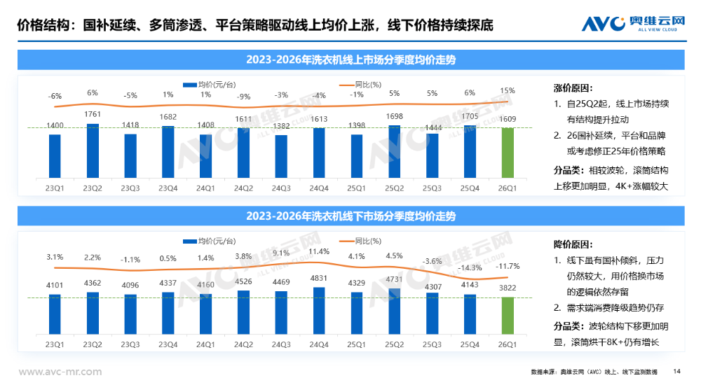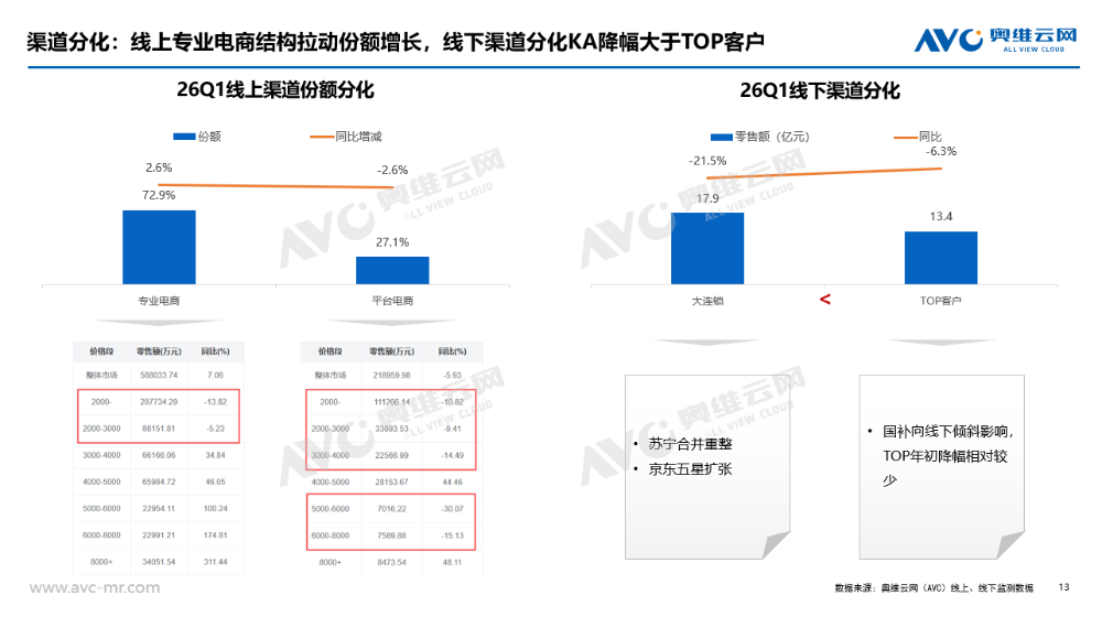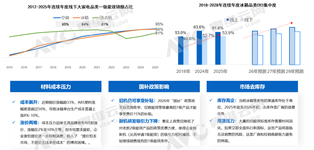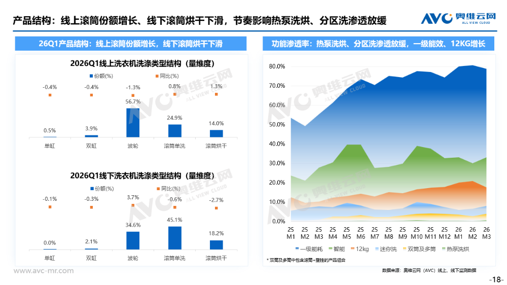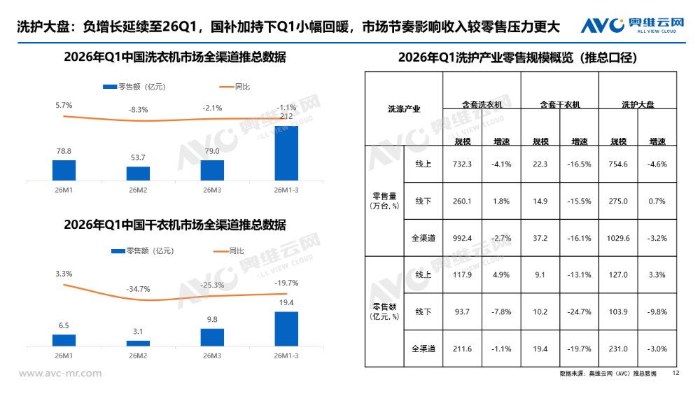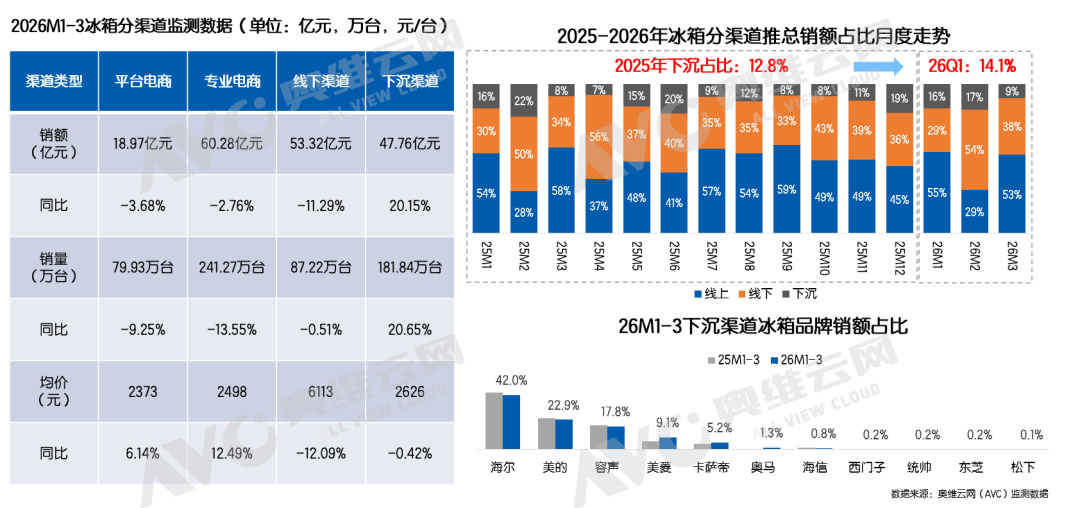 2026 年第一季度,国内家电市场在成本上行、需求偏弱、渠道结构持续调整的大环境下继续呈现结构性分化走势。冰箱行业在压力中逐步筑底,降幅有所收窄,2026年1季度,冰箱销额大盘同比下滑5.3%;洗护品类则在以旧换新政策托底下弱稳运行,细分赛道表现冷暖不一,大盘同比下滑1.1%。整体来看,行业尚未走出调整周期,但市场韧性逐步显现。2026 年第一季度冰箱市场依旧面临整体承压的行业环境,据奥维云网推总数据显示,26Q1季度冰箱市场销额大盘达271亿元,大同比下降 5.3%,销量大盘达773万台,同比下滑 5.0%。整体而言,行业仍未完全走出调整周期,但环比去年Q4季度而言,2026 Q1的大盘降幅已呈现明显收窄态势,市场释放出逐步趋稳的积极信号。具体分渠道表现来看,26Q1季度大盘能够维持小幅波动、未出现明显下探,核心得益于线上渠道与下沉市场的双重支撑,而传统线下渠道仍处于深度调整阶段,延续较高幅度的下滑趋势,奥维云网监测数据统计显示,2026 Q1季度线下渠道销额同比降幅已达11.29%,线下行业结构下行趋势明显。而值得注意的是下沉渠道,前期渠道库存去化成效显著,库存水位持续回落,26Q1渠道补库动力明显回升,市场需求逐步回暖,据AVC监测数据统计显示2026Q1下沉渠道销额同比增长 20.15%,成为拉动行业大盘、对冲线下压力的关键增长引擎。从行业结构来看,线上渠道以京东 C 端为代表的专业电商渠道,产品结构升级表现尤为突出:9000 元以上高端产品占比大幅提升 4.7 个百分点,而3K元以内低端机型占比下降 7 个百分点,结构上呈现清晰的高端化、品质化升级趋势。传统平台电商的价位结构也实现了小幅优化提升,整体向中高端稳步迈进。与之形成鲜明对比的是,抖音电商渠道呈现出明显的结构下行态势。尤其3K元以内低端价格段,2026年Q1季度该价位段占比同比大幅提升 12.1 个百分点。对于抖音这类流量成本与运营费率偏高的平台而言,产品结构快速下沉、高端占比持续萎缩,不仅会拉低整体客单价与盈利空间,也将对平台长期的品牌生态、利润水平与可持续发展产生不容忽视的冲击。2026 年开年,受中东地区地缘局势震荡影响,上游原材料价格大幅上涨。据悉3 月原油单月涨幅超 30%,直接推高塑料与制冷剂等核心原料价格。初步统计,ABS 塑料同比涨幅突破 50%,聚丙烯上涨超 26%,制冷剂更是飙升 80%,行业成本压力持续高企,企业生产端承压显著。尽管成本端压力持续加剧,但从市场监测数据来看,本轮原材料涨价并未立刻传导至终端零售均价。一方面,成本从上游原料到品牌定价、渠道分销再到终端落地,传导链条较长,涨价效应暂未完全反映在监测数据中;另一方面,当前市场竞争格局依旧激烈,各大品牌多持谨慎观望态度,普遍不愿率先提价,多以试探性策略观察市场与竞品反应。但成本压力终究会逐步传导至市场终端。我们判断,本轮原材料大幅上涨带来的压力,将在2026 年 Q2 集中释放,并倒逼冰箱行业加速新品迭代节奏。品牌方大概率将通过推出更高价位新品、上调新品定价等方式,将成本压力有序传导至终端市场。在能效标准方面,新版能效新规将于今年 6 月正式实施。此前行业普遍预计,新标准落地后,市场将快速完成新能效产品的迭代切换。但从当前行业实际运行情况来看,这一进程已明显放缓。一方面,企业正面临持续加剧的成本压力;另一方面,行业整体仍处于高库存去化阶段,叠加现行以旧换新国补政策,对非新标能效机型依旧给予补贴支持。多重因素共同作用下,企业研发、导入新能效产品的积极性明显不足。综合多方因素判断,新能效标准在终端市场的落地节奏将不及此前预期,新能效产品的规模化普及进程或将显著延后。产品趋势:基础功能高度渗透,实用刚需功能引领产品竞争从产品趋势来看,当前主流技术的零售量渗透率已基本实现普及,例如风冷、一级能效等基础配置渗透率均达到 70% 以上,十字四门、法式四门、平嵌等形态化卖点虽未完全饱和,但也正处于快速渗透阶段。现阶段仍具备明显溢价能力的功能,主要集中在制冰机、双系统、零嵌等方向。但整体来看,冰箱行业尚未出现具备颠覆性、差异化的突破性技术,行业整体创新进入相对平缓的瓶颈期。在此背景下,实用刚需类的高感知功能成为市场竞争的核心抓手。行业技术创新趋缓,难以有效刺激用户主动换新,市场整体消费动力不足。加之消费者日趋理性,更注重实用与高性价比,需求回归刚需本质。因此,能够被用户直观感知、带来切实体验提升的功能,正成为品牌竞争的关键,例如超大容量、制冰机、大冷冻空间等,凭借强实用性和高可见度,成为拉动消费的重要卖点。与此同时,小容积产品亟待重新定义。尽管大容积已是行业明确趋势,但 400L 以下中小体积产品仍占有稳定的市场份额。当前这类产品普遍存在功能同质化严重、情绪价值与设计亮点不足的问题,难以激发年轻群体及细分场景用户的购买兴趣,亟需在定位、设计与价值表达上重新塑造,实现差异化突破。洗护大盘:负增长延续至26Q1,市场节奏影响收入压力较大2026年的第一季度,中国洗护市场在“以旧换新”国补政策的延续中拉开序幕。据奥维云网(AVC)推总数据,2026年Q1中国洗衣机市场全渠道零售额为211.6亿元,同比降幅1.1%;干衣机市场表现承压更为明显,全渠道零售额为19.4亿元,同比降幅19.7%。尽管政策带来一定托底作用,