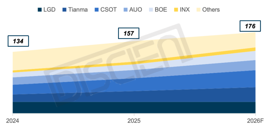 根据DISCIEN数据统计2025年全球LTPS车载面板月产能约157K大板(未考虑稼动率及良率),2026年虽有减少JDI J1产能,但随着BOE B20的量产及其余陆厂与台厂的产能扩充/资源倾斜,DISCIEN预测整体产能将攀升至176K。