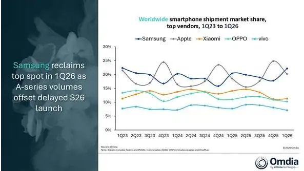 三星以22%的市占率位居全球第一,Galaxy S26系列市场表现强劲,推动份额同比提升。