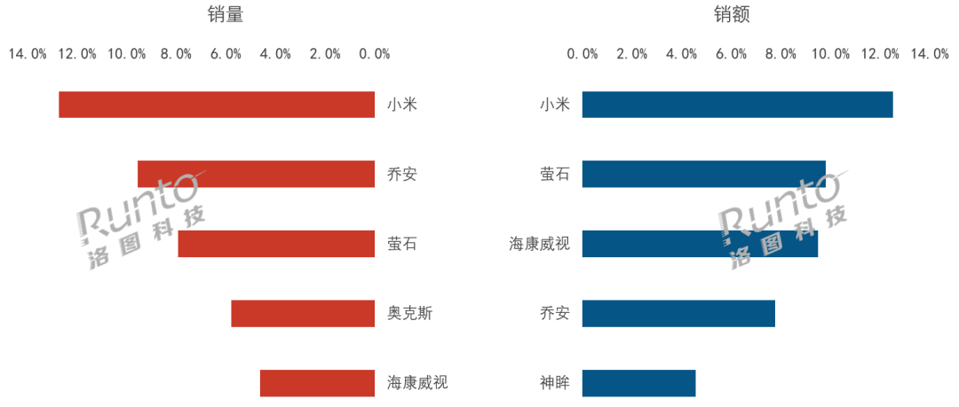 小米在线上全渠道销量与销额的维度上均占据首位,销量份额达12.7%。其在稳固室内市场基本盘的同时,正加速向室外场景渗透,在第一季度推出了4G摄像头新品。