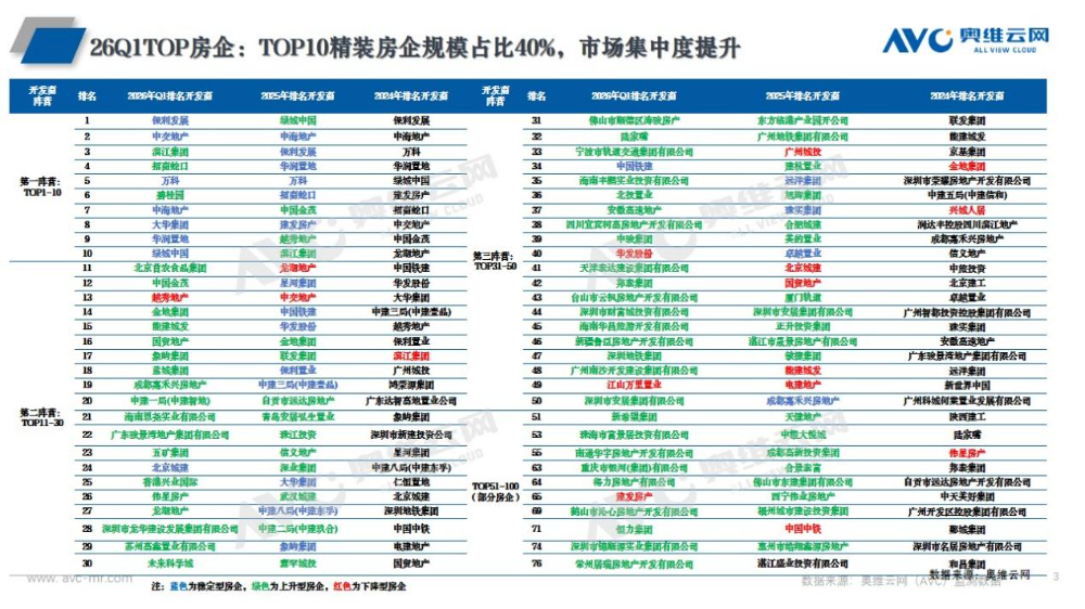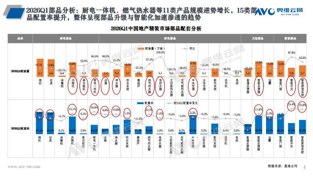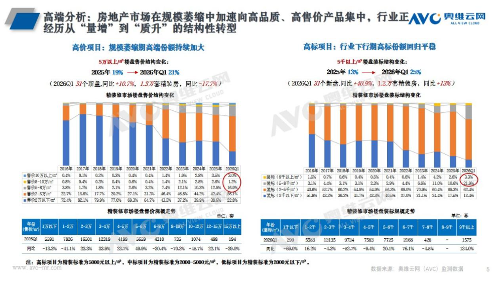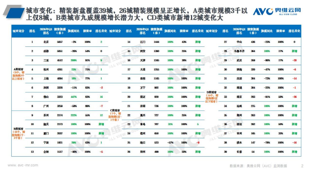 2026年一季度,政策层面,中央坚持着力稳定房地产市场、推动房地产高质量发展总基调,持续强化房地产市场稳定发展的顶层设计。经济层面,中国房地产行业仍处于筑底调整过程中,但各项指标规模持续收缩、核心指标跌幅有所改善,全国精装修商品住宅新开盘体量出现扭转性增长。精装规模:一季度新盘132个(同比+14.8%) 、5.89万套(同比-3.2%),3月迎来规模回正喜讯,市场呈现“供给面修复拉动市场筑底企稳”特征奥维云网(AVC)监测数据显示,2026Q1全国商品住宅新开盘项目385个,同比+22.2%,规模19.47万套,同比-4.9%,其中精装修商品住宅新开盘项目132个,同比+14.8%,规模5.89万套,同比-3.2%,精装渗透率为34.3%,同比-2.2%,精装修市场呈现项目量增长、规模降幅大幅收窄迹象。同时3月精装修市场迎来了项目个数连续回正及单月体量双增长回正喜讯,3月精装修新开盘项目75个,同比+27.1%,环比+134.4%;规模3.39万套,同比+10.9%,环比+128.8%。从区域市场结构来看,2026Q1精装修市场主要以华南和华东两大区为主力市场,合计市场份额超七成,华南、东北、西北区受单个城市增长影响规模上升;从城市性质来看,新一线城市精装规模最大,市场份额为32.9%,一线、新一线城市份额超六成,其他城市受万宁、澄迈等精装新盘规模带动呈现高增长。城市分析:覆盖39城,超一半城市规模呈正增长,A类城市规模领衔,B类及以下城市增长潜力突出奥维云网(AVC)监测数据显示,2026Q1精装修市场参与新盘开盘上市的城市有39城,其中26个城市精装规模呈正增长,TOP3城市分别为北京、成都、三亚,规模分别为5657套、5051套、4512套,从城市增速来看,三亚、佛山及苏州增速较快,同比均大幅增长。A类城市中,规模3千以上有8城,规模增长的城市有三亚、杭州、上海、佛山4个城市,B类城市中,九成规模增长潜力大,规模增长城市有苏州、韶关、厦门等9个城市,CD类规模增长城市有万宁、澄迈、济南等13个城市,其中新增城市12个。另外,从高标项目分析,2026Q1参与高标项目的城市共14个,64%的城市高标规模呈现正增长。2026Q1高标项目中TOP5城市分别为杭州、广州、上海、三亚和北京,TOP5城市合计占比超五成,杭州、上海发力迅猛,规模增速较快。从房企端分析,保利发展在佛山、上海、广州等多城占据主导地位;地方性房企垄断市场明显,如韶关、澄迈、嘉兴等城市出现单一房企100%垄断现象。房企分析:头部房企集中度提升,新进入房企活跃,市场竞争格局加速分化2026Q1精装市场中,TOP3房企分别为保利发展、中交地产、滨江集团,从增速来看,滨江集团、招商蛇口增速明显,同比增长较大。从房企阵营来看,TOP10精装房企规模占比40%,较2025Q1规模占比38%上升2个百分比,市场集中度仍在提升,TOP10精装房企中,有三家换位,滨江集团、招商蛇口、碧桂园进入前十阵营,越秀地产下滑至第二阵营,TOP11-30精装房企中,约70%房企为新进入者,如:金地集团、象屿集团、北京首农食品集团等,其余房企中88%以上都是新进入房企。从高标项目分析,2026Q1参与高标项目的房企共21家,其中TOP10房企规模占比78%,2026Q1高标项目中TOP3房企分别为滨江集团、保利发展、中海地产,TOP3房企合计份额占四成,从合作城市来看,TOP房企合作TOP城市多为一线城市及新一线城市,大部分房企高标项目以深耕本土市场为主。2026Q1精装修市场中,厨电一体机、冰箱、燃气热水器、智能开关、智能家居系统等11类产品规模逆势增长,从配置率来看,15类部品配置率提升,其中洗碗机、厨电一体机、智能坐便器、智能开关、智能家居系统产品配置率大幅增长。可见新兴部品中洗碗机、厨电一体机、智能坐便器、智能家居系统产品配置率持续保持增长。未来随着部品配置率持续高配,中国精装住宅既能保障中国新房消费者高品质需求,又能带动新科技产品量化普及。高端分析:房地产正加速向高品质住宅发展,行业正经历从“量增”到“质升”的结构性转型精装修市场呈现出“总量收缩、高端扩张”的鲜明特征,高端市场表现为高售价和高装标项目的占比在整体市场萎缩中逆势扩大。从售价结构看,2026Q1中国房地产精装修市场新开盘高端项目(售价5万以上/㎡)共31个,精装规模1.3万套,占比21%(其中5-8万/㎡结构比最大,占16.9%),较2025年有显著提升,而2万/㎡以下的楼盘占比则大幅压缩至22.8%。从装标结构看,5000元/㎡以上的高装标项目占比从2025年13%跃升至2026Q1 25%(其中5-8千/㎡结构比最大,占21.9%),2000-5000元/㎡的中标和2000元/㎡以下的低标规模占比均有所下降。与此同时,高端项目(售价5万以上/㎡)新开盘数量同比+10.7%,但精装房套数同比-17.7%,表明精装修市场在项目个数增长、单盘规模收缩下的结构性调整,精装修市场正经历从“量增”到“质升”的结构性转型。结语:展望2026年二季度市场趋势,预计房地产行业将进一步延续趋稳,精装新盘持续保持在高能级城市的高质量发展。中央政策将以“稳市场、防风险、建长效、促转型”为主线,全面落地“控增量、去库存、优供给”施政体系;地方政策将对标中央部署,在产品品质提升、需求精准扶持、住房保障扩面、土地存量盘活四大维度持续发力,推动市场从修复转向提质增效,助力行业平稳迈入高质量发展新周期。奥维云网原创文章,未经授权,禁止任何机构或个人抓取本文内容,用于训练AI大模型等用途。