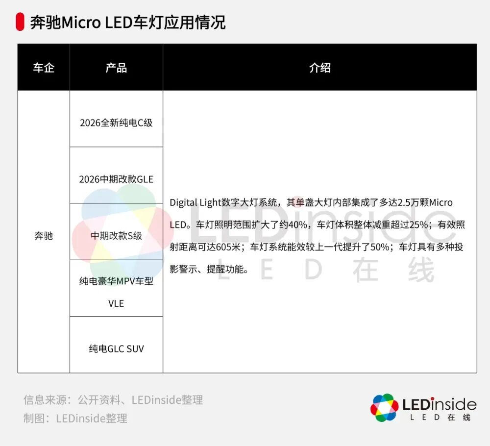 2026年恰逢梅赛德斯-奔驰发明汽车140周年,奔驰正在以140年创新之路为主题开展全球活动,2026年至2027年间,奔驰计划将在全球推出超过40款新车型,仅中国市场就将引入超过15款全新及改款车型,覆盖从新生代豪华到高端豪华的各细分市场,涵盖燃油、混动、纯电等多种驱动方式。在这些新车型中,应用Micro LED技术的新一代Digital Light数字大灯系统正成为奔驰品牌的重要技术标签。在Micro LED技术加持下,新一代Digital Light数字大灯系统相比前代,车灯照明范围扩大了约40%,显著提升了夜间弯道视野的清晰度;车灯体积整体减重超过25%;有效照射距离可达605米;车灯系统能效较上一代提升了50%;车灯具有多种投影警示、提醒功能。今年初发布的新款S级轿车就搭载了最新一代Digital Light数字大灯系统,单盏大灯内部集成多达2.5万颗Micro LED,双灯合计达5万颗。此外,近期发布的纯电豪华MPV VLE、中期改款GLE,以及纯电GLC SUV也搭载了应用新一代Digital Light数字大灯系统。Micro LED车灯技术不仅能实现更精准的防眩目控制,还可结合车载摄像头与高精地图数据实时调整远光角度,在特定市场还能针对行人和自行车等弱势用路人提供更精准的识别与补光,甚至可在路面投射车道偏离警示、逆向提醒等交互信息,成为了高端汽车品牌的代表技术。而奔驰正逐步将Micro LED车灯从旗舰车型下放至核心豪华产品线,快速成为Micro LED车灯主要应用厂商。据悉,2026年,奔驰将计划发布16款新车型,因此今年有望见证Micro LED车灯技术加速上车的新趋势。