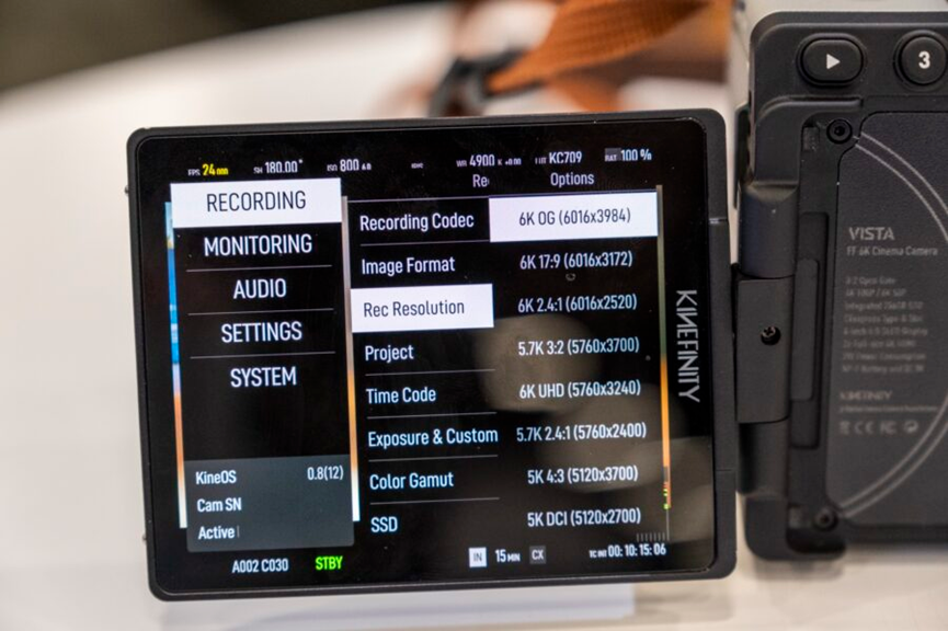 Vista 采用铝合金方盒设计,尺寸约掌心大小,内置全画幅 6K 传感器,搭配卓曜原生 KineMount 卡口。官方暂未公布最终分辨率与编码规格,但展台展示的原型机菜单列出了丰富的录制格式,包括:6K OpenGate(6016×3984)、6K 17:9(6016×3172)、6K 2.4:1(6016×2520)、5.7K 3:2(5760×3700)、6K UHD(5760×3240)、5.7K 2.4:1(5760×2400)、5K 4:3(5120×3700)、5K DCI(5120×2700)。