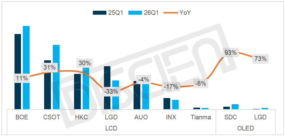 BOE(京东方):26Q1出货13.0M,同比增长11%,稳居第一,市占32%。BOE核心客户Dell/HP等商用需求维持强劲,消费品牌和二线市场需求也相对稳定,整体出货增长明显。从生产来看,在需求支撑下,各产线稼动保持高位,但B10/B4 MNT生产仍受到明显的产能挤压,整体IPS供应依旧紧张。